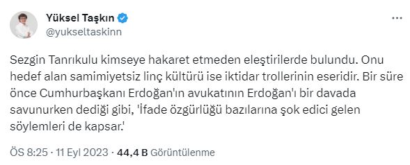 Son dakika haberi... CHP Diyarbakır Milletvekili Sezgin Tanrıkulu'nun TSK'yı hedef alan skandal sözlerine FETÖ güzellemeleri ile bilinen "Kemalizm ırkçılıktır" ifadeleri nedeniyle de Atatürkçü seçmenin tepkisini çeken CHP PM Üyesi ve İzmir Milletvekili Yüksel Taşkın'dan destek geldi. CHP'li Taşkın, Tanrıkulu'nun kimseye hakaret etmediğini sadece eleştirilerde bulunduğunu savundu.