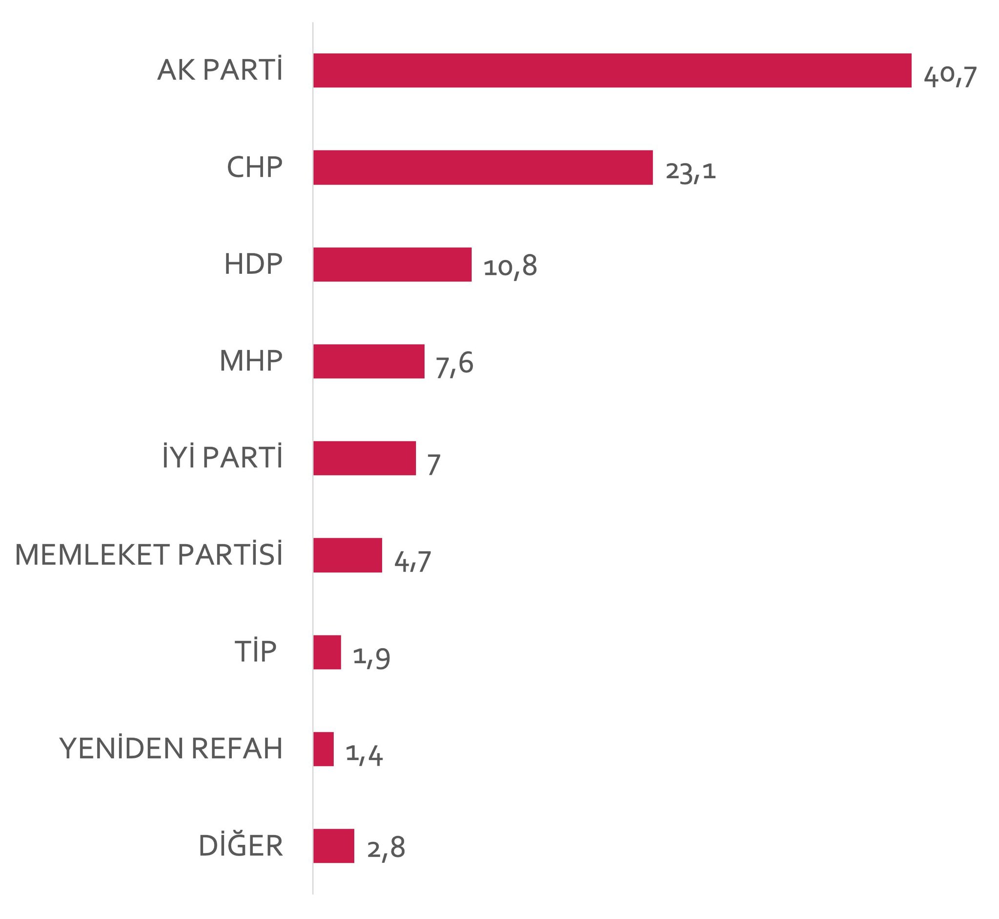 Buna göre; AK Parti'nin oy oranı yüzde 40'ı aştı, MHP'nin oy oranı ise İYİ Parti'yi geçti. CHP'nin oy oranı ise yüzde 25'in altında kaldı. HDP'nin oy oranı ise yüzde 10'u aştı. İşte son seçim anketi, partilerin ve ittifakların oy oranları...
