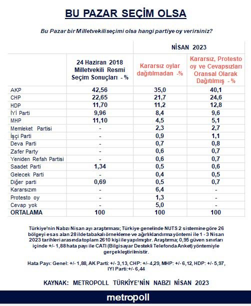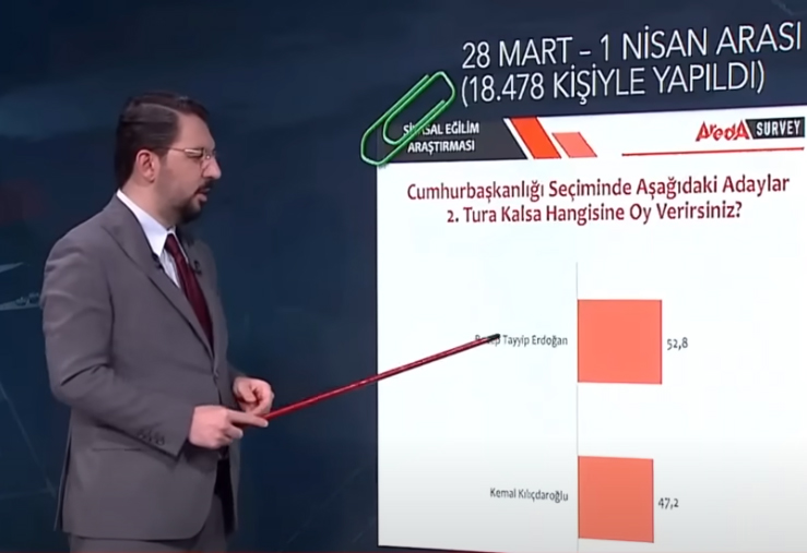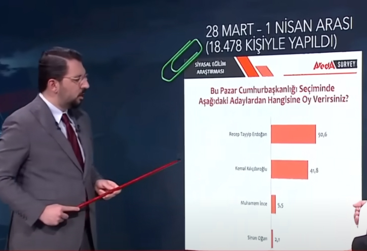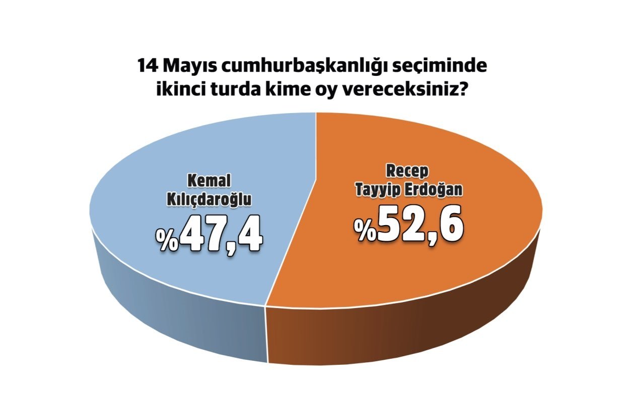 Ankete katılan vatandaşların yüzde 50,8'i Başkan Recep Tayyip Erdoğan'dan yana oy kullandı. Bu sonuca göre Başkan Erdoğan, ilk turda seçimi kazanıyor. 7'li koalisyonun Cumhurbaşkanı adayı Kemal Kılıçdaroğlu'nun oy oranı ise yüzde 43.1'de kaldı. Memleket Partisi Genel Başkanı Muharrem İnce yüzde 4,5, ATA İttifakı'nın Cumhurbaşkanı adayı Sinan Oğan ise yüzde 1,6 oy aldı.