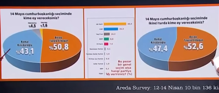 Areda'nın son seçim anketine göre vatandaşlara "14 Mayıs cumhurbaşkanlığı seçiminde ikinci turda kime oy vereceksiniz?" sorusu da yöneltildi.