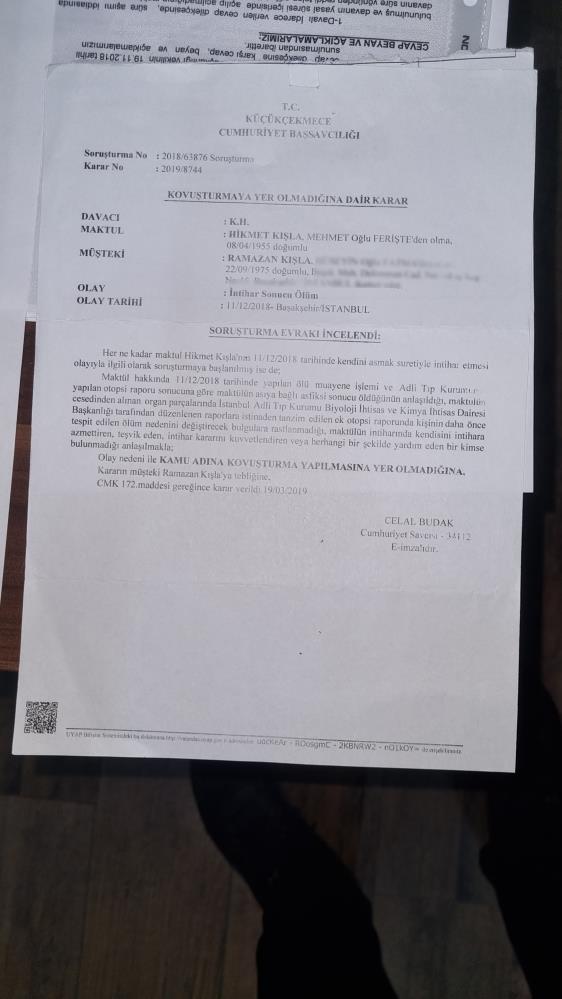 Özellikle sık sık takip ediyordu süreci. Ruhsal olarak da sıkıntı yaşıyordu. O süreçte en son hayatına son vermeden birkaç gün önce sanıyorum belediye de ki bir görüşmede arsaların tapusunu alamayacağı izlenimi edinmişti. O umutsuzlukla hayatına son verdi. Bıraktığı notta 'Suçlu Beylikdüzü Belediye Başkanı Ekrem İmamoğlu' yazılı bir not bıraktı. Biz bu notu ilgili soruşturmayı yürüten savcıya da iletmiştik zaten. Ancak savcı takipsizlik kararı verdi" ifadelerini kullandı.