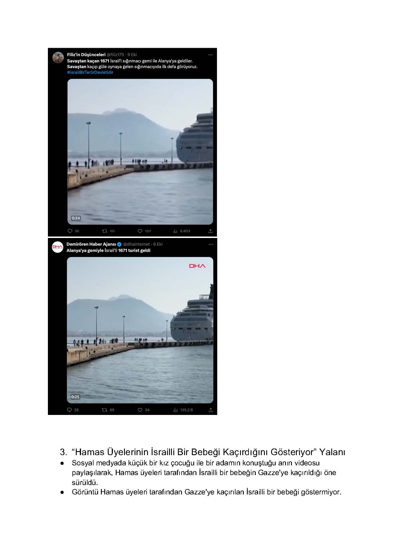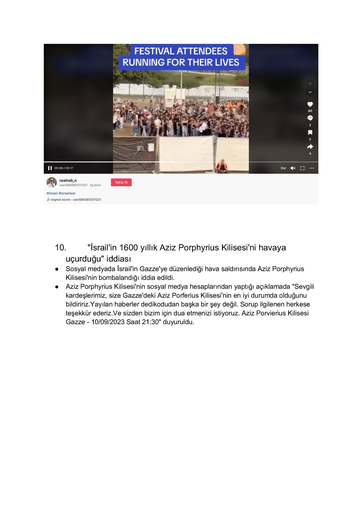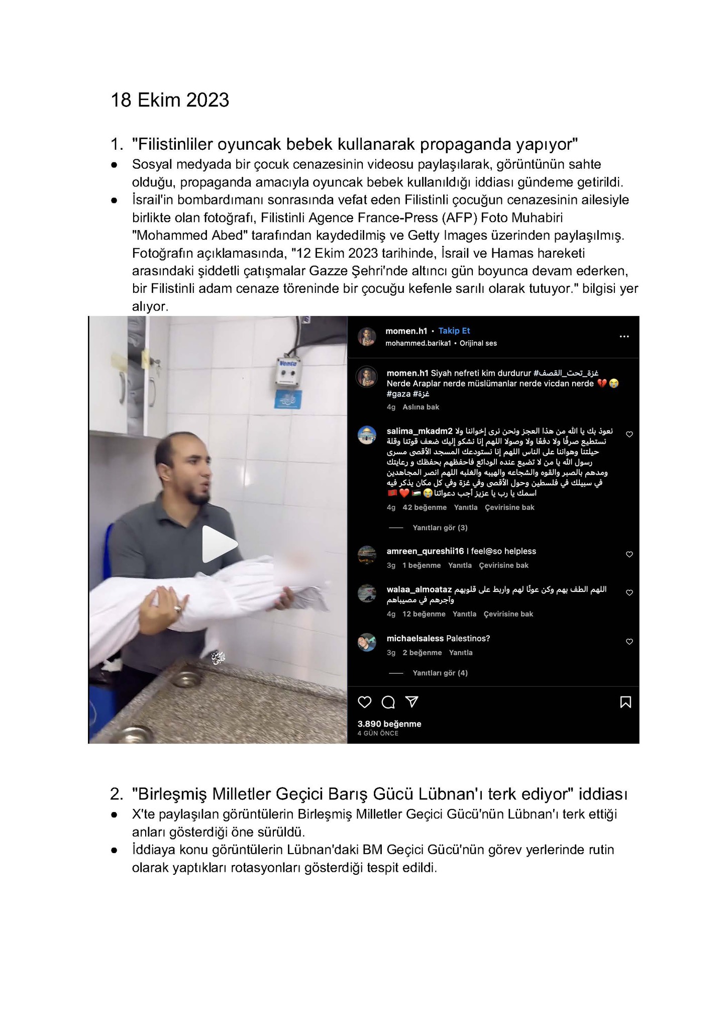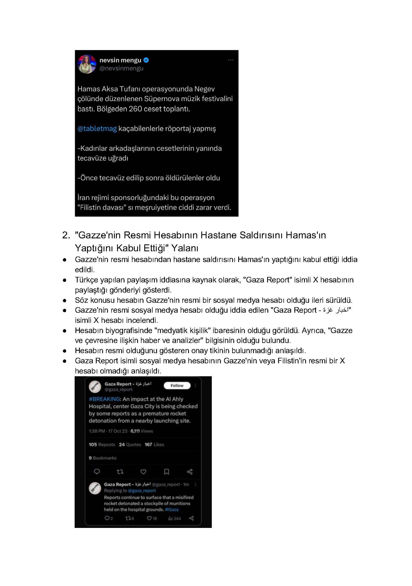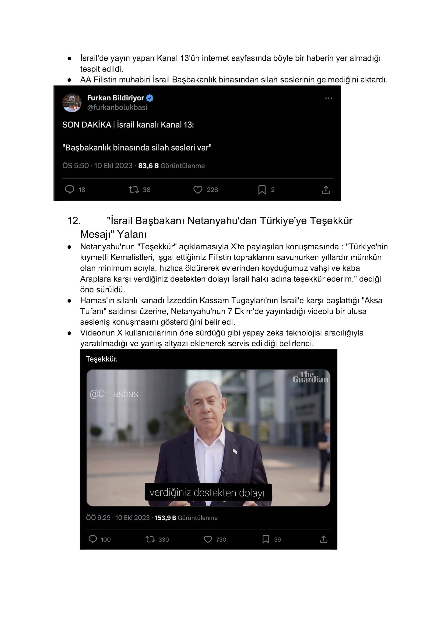 İsrail yıllardır süren Filistin'e yönelik zulmünü son yaşanan gerilimle birlikte zirveye çıkardı. Her gün Filistinlilerin üzerine bombalar yağıyor. İsrail'in Gazze'deki El Ehli Baptist Hastanesine yaptığı bombalı saldırı ise tam anlamıyla yürekleri yaktı. İsrail 500 masum sivili katletti. Katliamda hayatını kaybedenlerin çoğunun çocuk kadın ve yaşlılar olduğu açıklandı. Öte yandan her kanlı saldırının ardından manipülasyonlarla olayları örtbas etmeye çalışan İsrail ile sosyal medyada İsrail'i aklamaya çalışan hesapların operasyonları İletişim Başkanlığı Dezenformasyonla Mücadele Merkezi tarafından tek tek ifşa edildi. İşte Gazze saldırılarında yalanlar ve gerçekler...