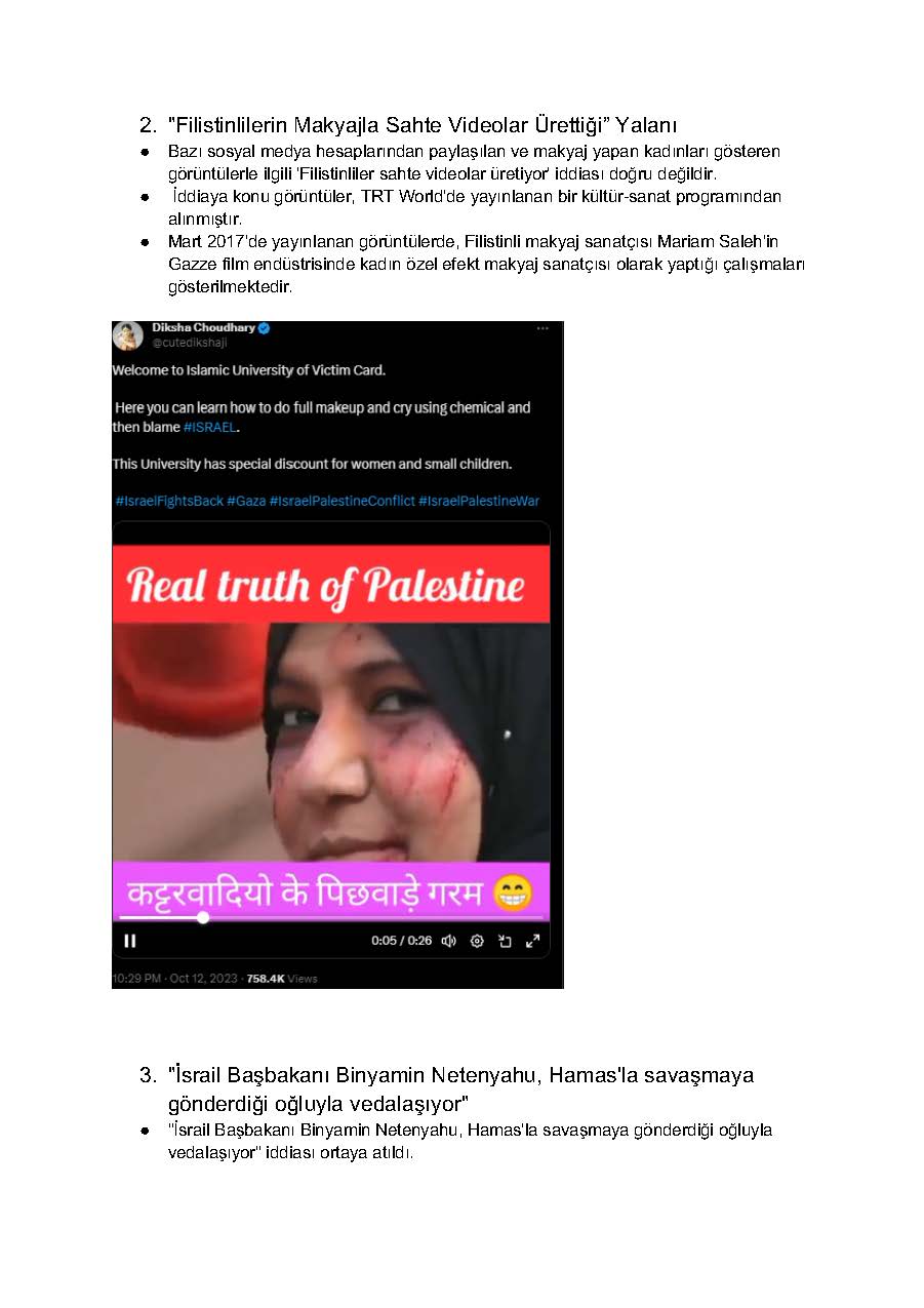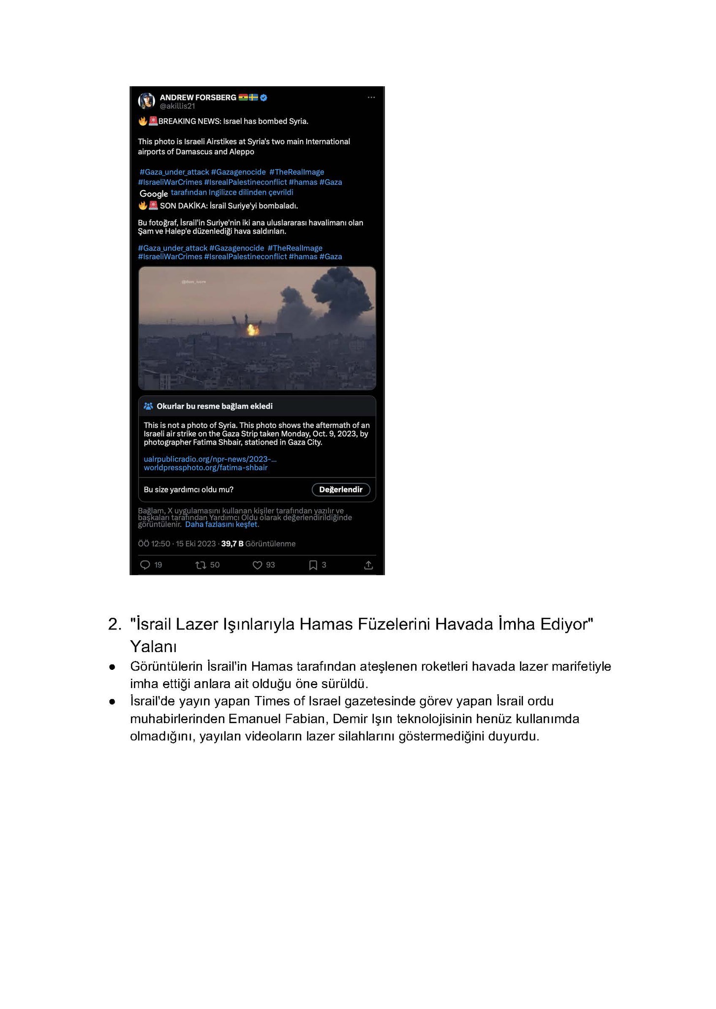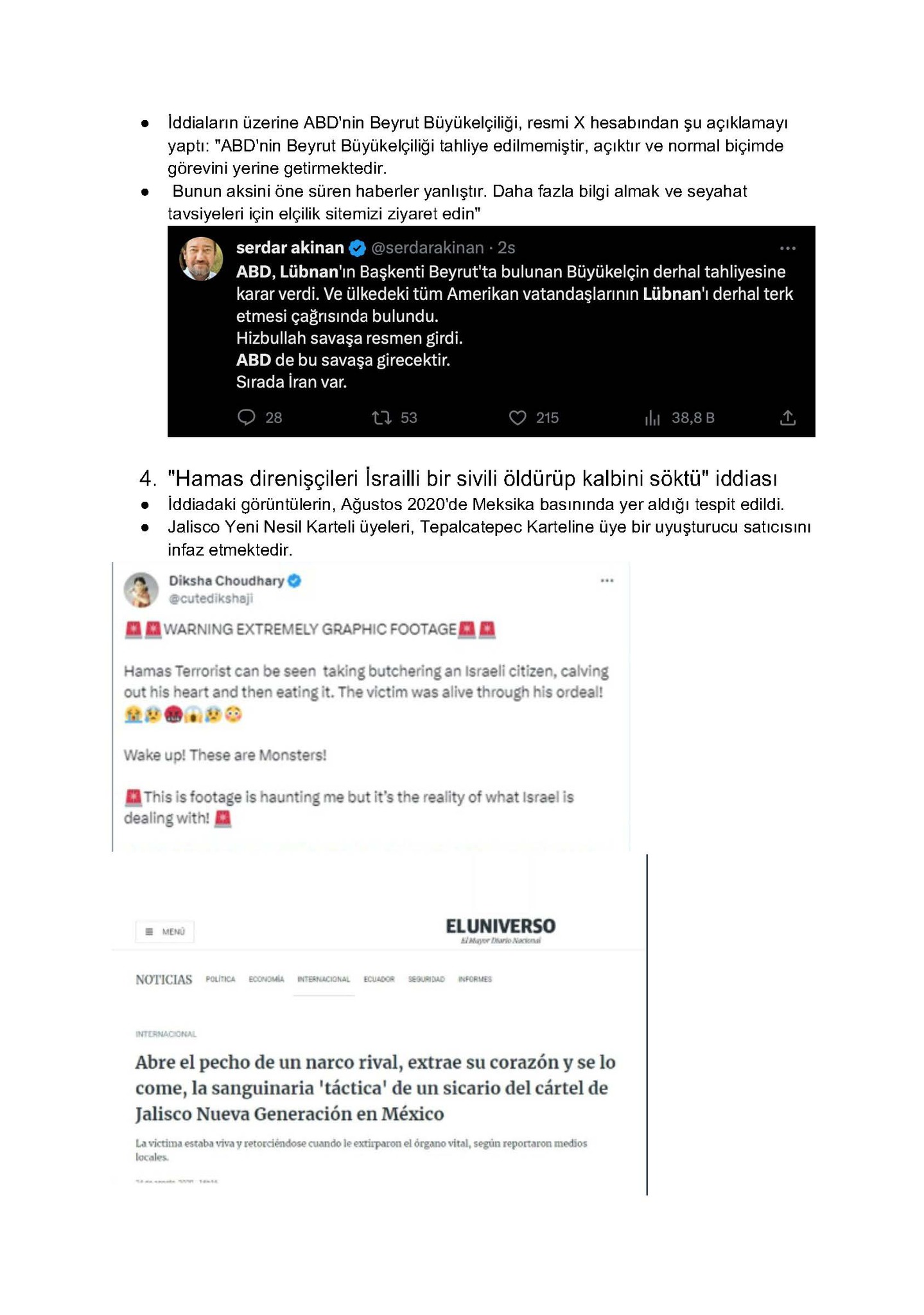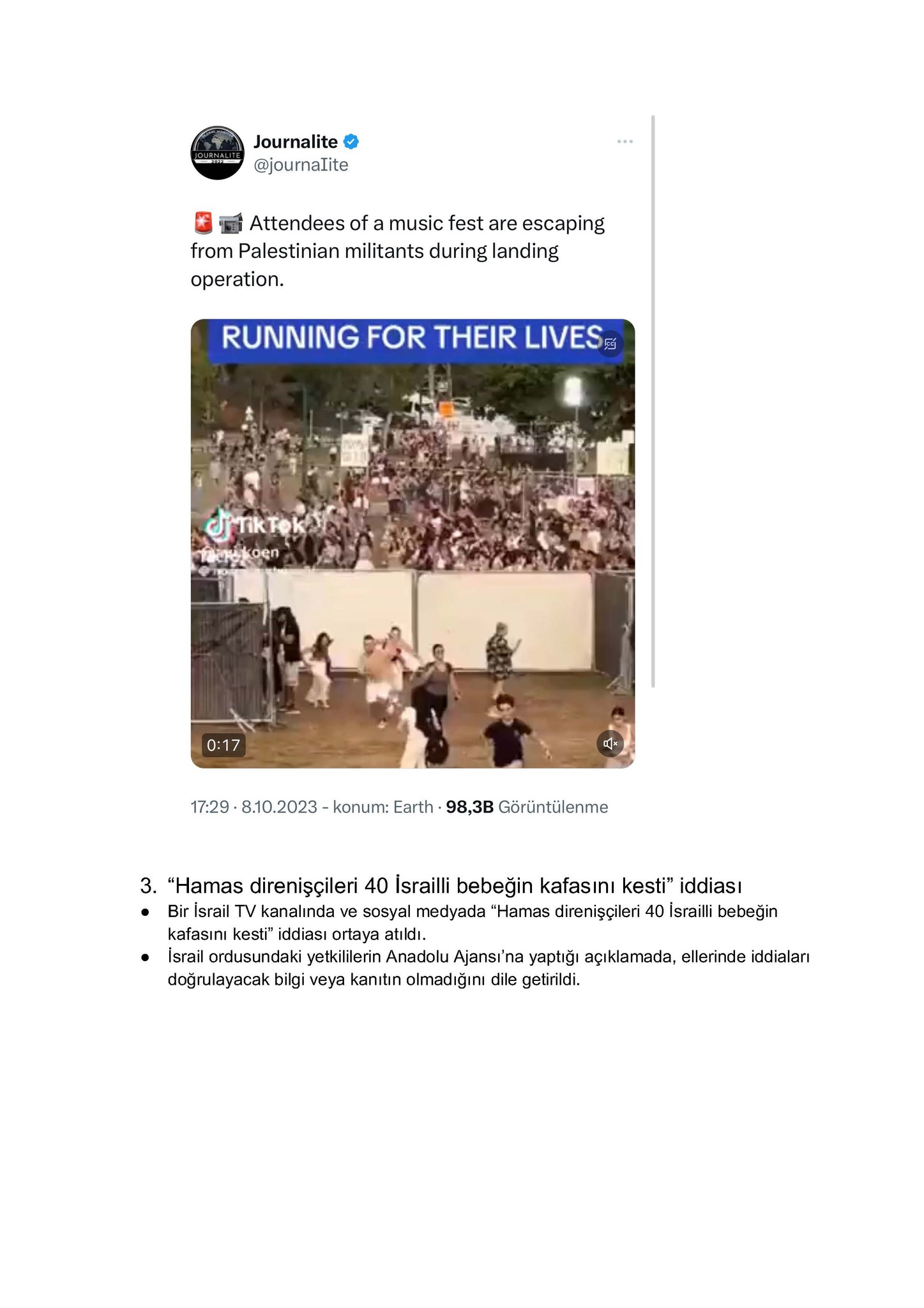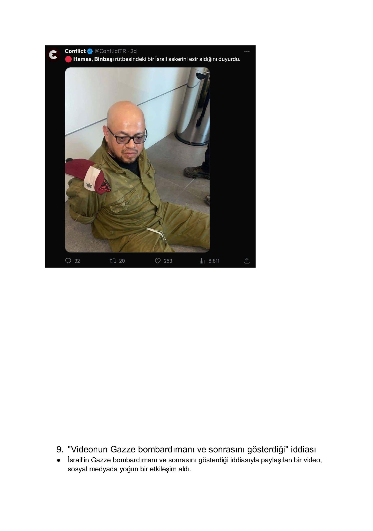 İsrail yıllardır süren Filistin'e yönelik zulmünü son yaşanan gerilimle birlikte zirveye çıkardı. Her gün Filistinlilerin üzerine bombalar yağıyor. İsrail'in Gazze'deki El Ehli Baptist Hastanesine yaptığı bombalı saldırı ise tam anlamıyla yürekleri yaktı. İsrail 500 masum sivili katletti. Katliamda hayatını kaybedenlerin çoğunun çocuk kadın ve yaşlılar olduğu açıklandı. Öte yandan her kanlı saldırının ardından manipülasyonlarla olayları örtbas etmeye çalışan İsrail ile sosyal medyada İsrail'i aklamaya çalışan hesapların operasyonları İletişim Başkanlığı Dezenformasyonla Mücadele Merkezi tarafından tek tek ifşa edildi. İşte Gazze saldırılarında yalanlar ve gerçekler...