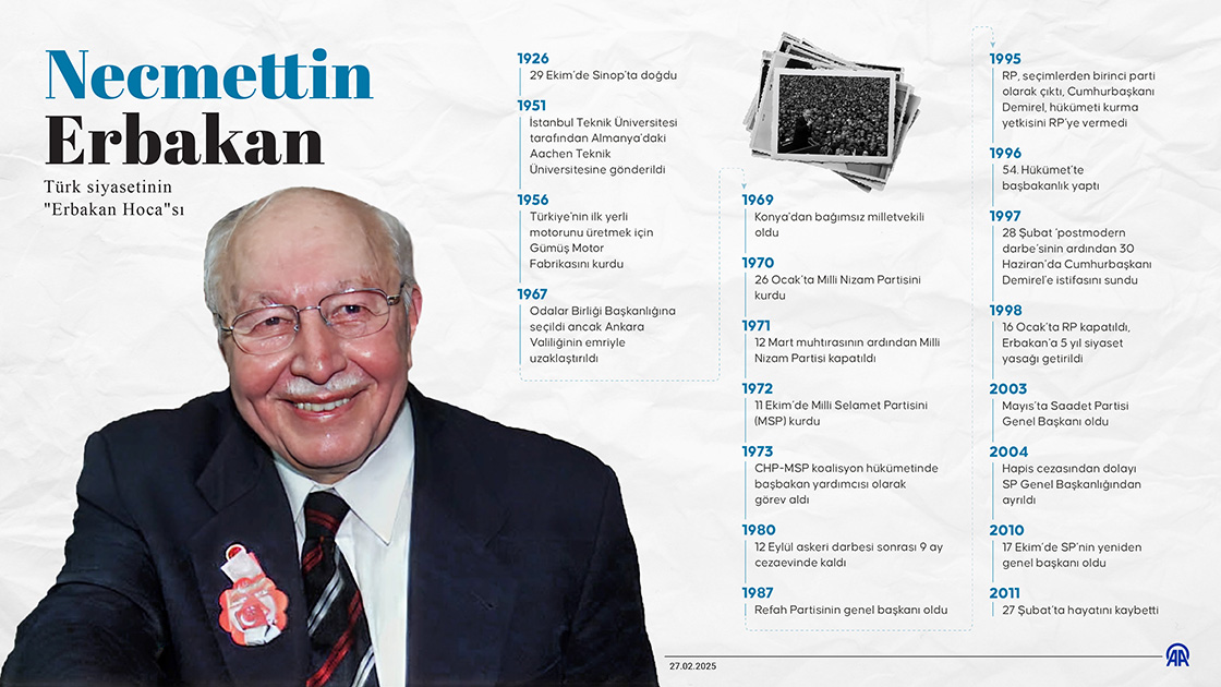 Milli Görüş hareketinin kurucu lideri ve Türk siyasetinin hocası merhum başbakanlardan Necmettin Erbakan'ın vefatının üzerinden 14 yıl geçti. "Yaşanabilir bir Türkiye", "Yeniden büyük Türkiye" ve "Yeni bir dünya" idealleriyle Türk siyasetine yeni bir anlayış getiren Erbakan, Fikir babası olduğu D-8 oluşumuyla Türk ve Müslüman alemine "kurtuluş reçetesi" sundu, dünyadaki Müslümanları tek çatı altında toplamayı hedefledi. Öte yandan Başkan Erdoğan, merhum Prof. Dr. Necmettin Erbakan'ı vefatının 14'üncü yılında andı. Erdoğan paylaşımında, "Hizmet ve dava adamı Prof. Dr. Necmettin Erbakan hocamızı vefatının 14'üncü seneidevriyesinde rahmetle yâd ediyorum." dedi.