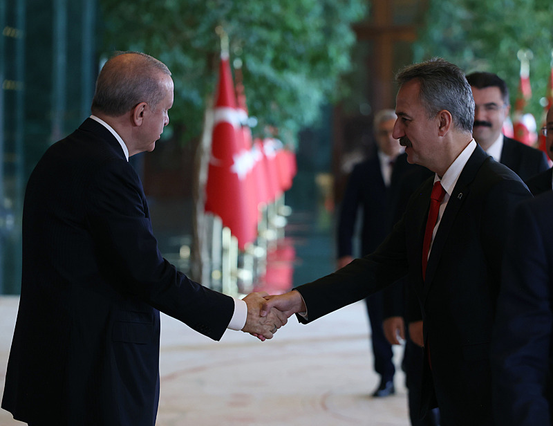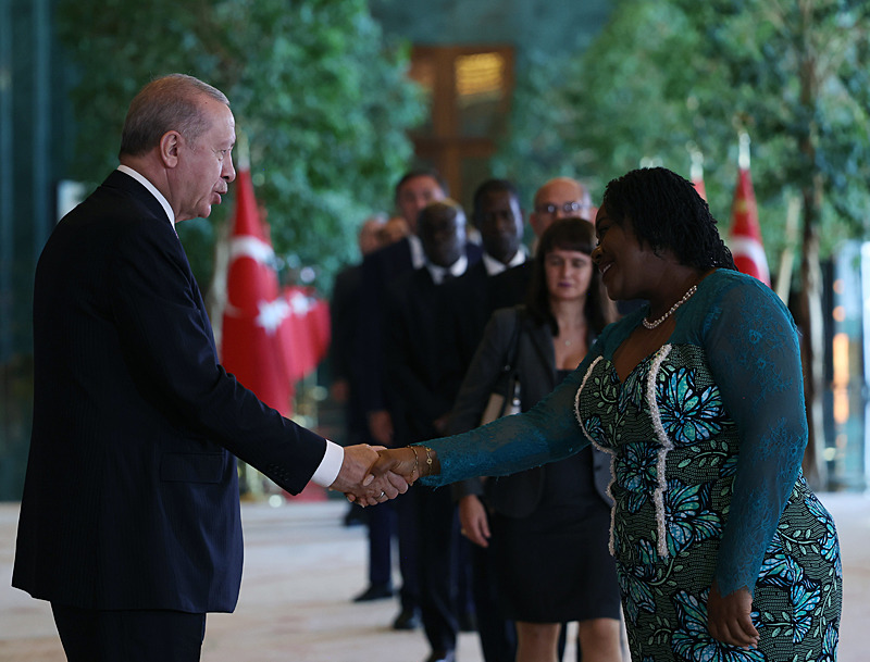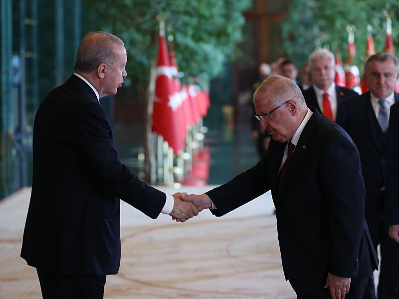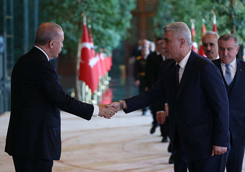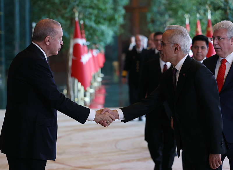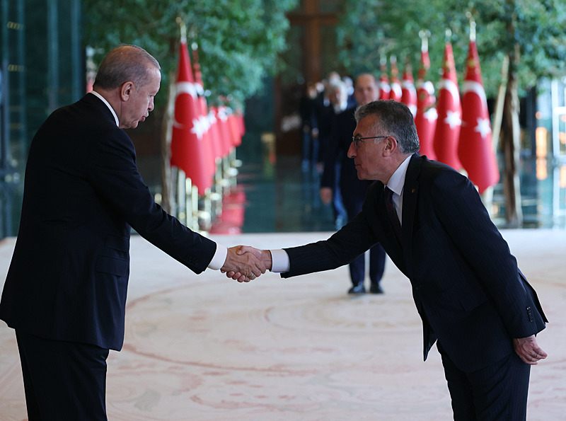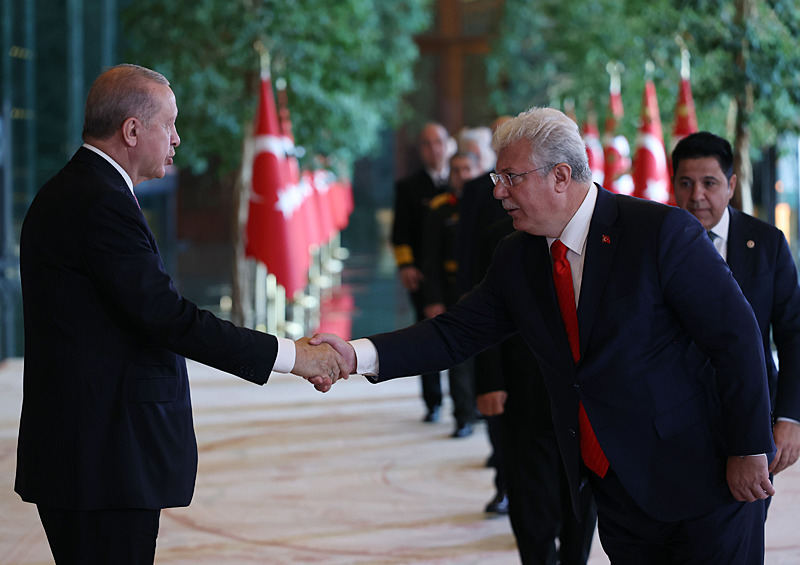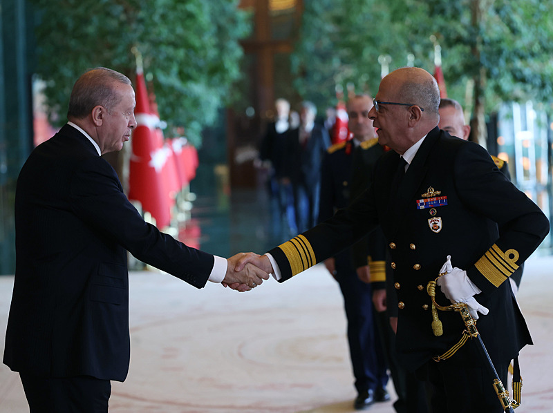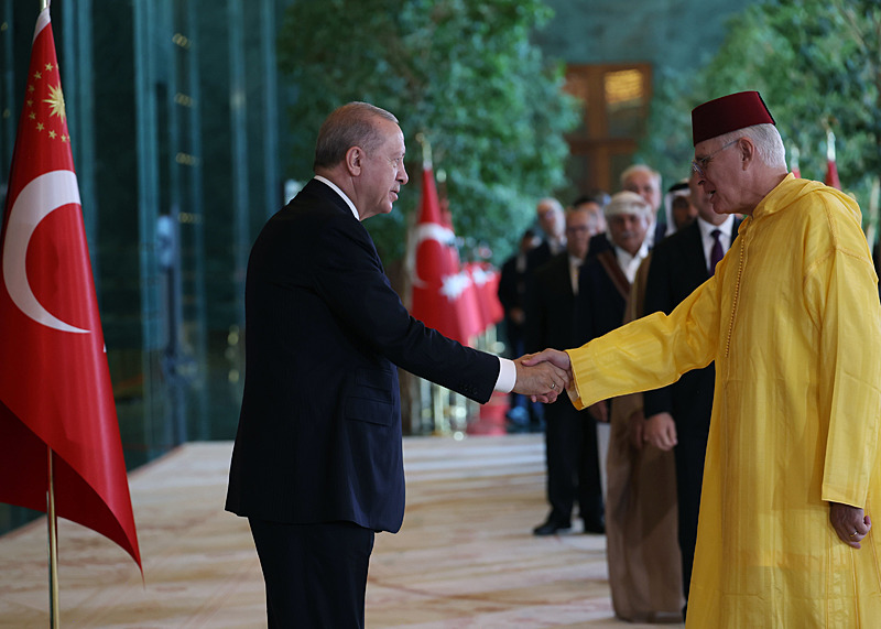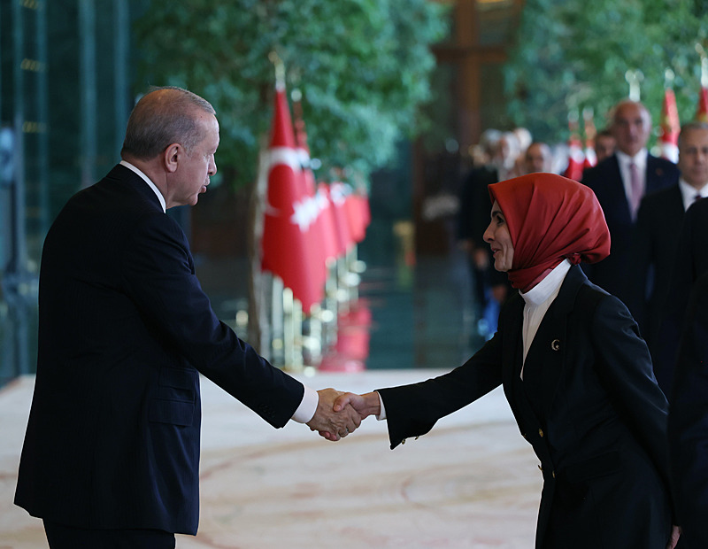 Cumhurbaşkanlığı Külliyesi ana bina girişinde düzenlenen törende; TBMM Başkanı Numan Kurtulmuş, Cumhurbaşkanı Yardımcısı Cevdet Yılmaz, AK Parti TBMM Grup Başkanı Abdullah Güler, Yargıtay Başkanı Ömer Kerkez, Danıştay Başkanı Zeki Yiğit, Cumhurbaşkanlığı Kabinesi üyeleri, Genelkurmay Başkanı Orgeneral Selçuk Bayraktaroğlu ve kuvvet komutanları, Diyanet İşleri Başkanı Safi Arpaguş, TBMM üyeleri, Cumhurbaşkanlığı Genel Sekreteri Hakkı Susmaz, İletişim Başkanı Burhanettin Duran, MİT Başkanı İbrahim Kalın, Savunma Sanayii Başkanı Haluk Görgün, Ankara Valisi Vasip Şahin, Ankara Büyükşehir Belediye Başkanı Mansur Yavaş, kamu kurumlarının yöneticileri, Ankara'da görevli büyükelçiler, yabancı misyon şefleri, uluslararası kuruluşların temsilcileri, Başkan Erdoğan'a tebriklerini sundu