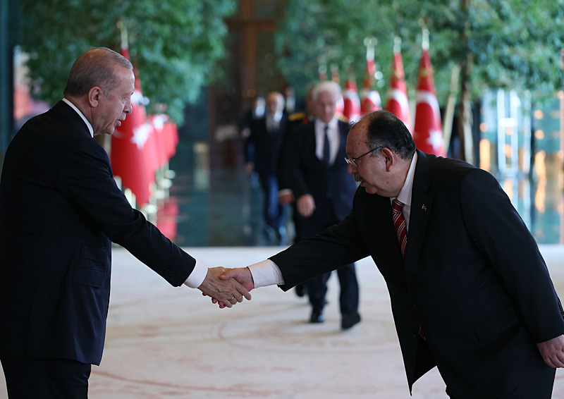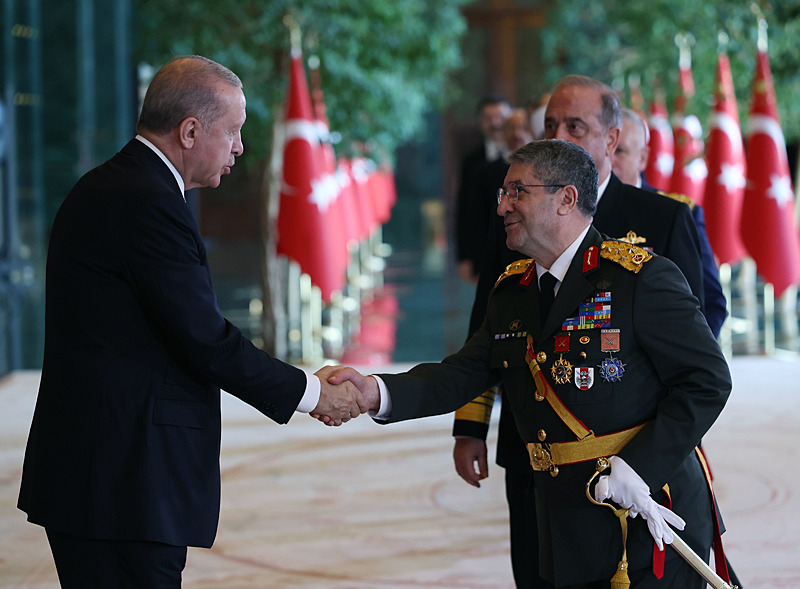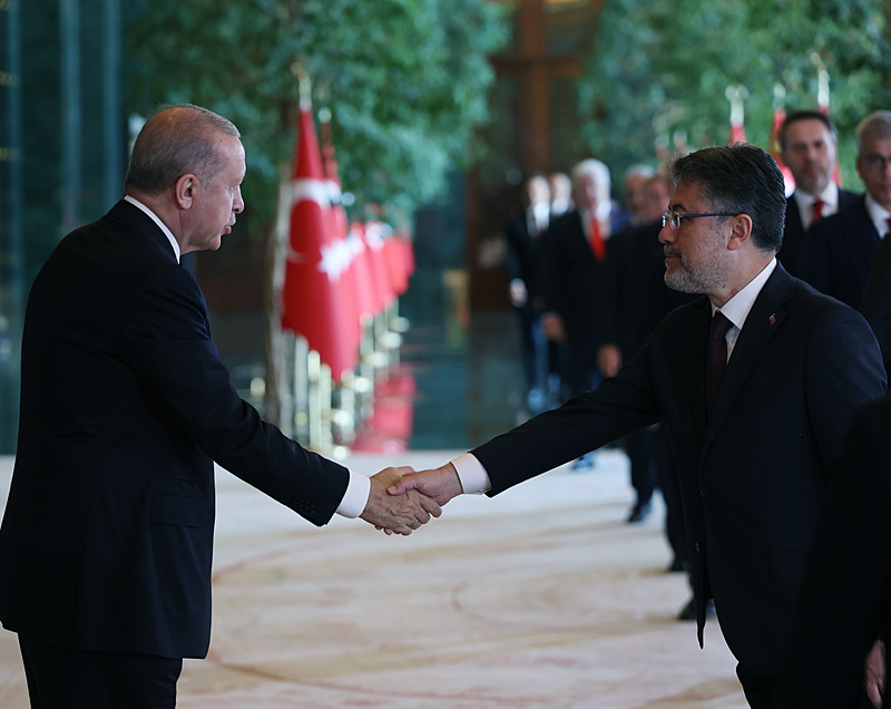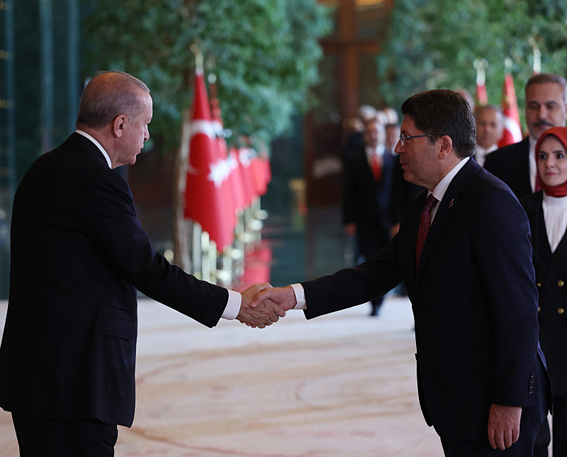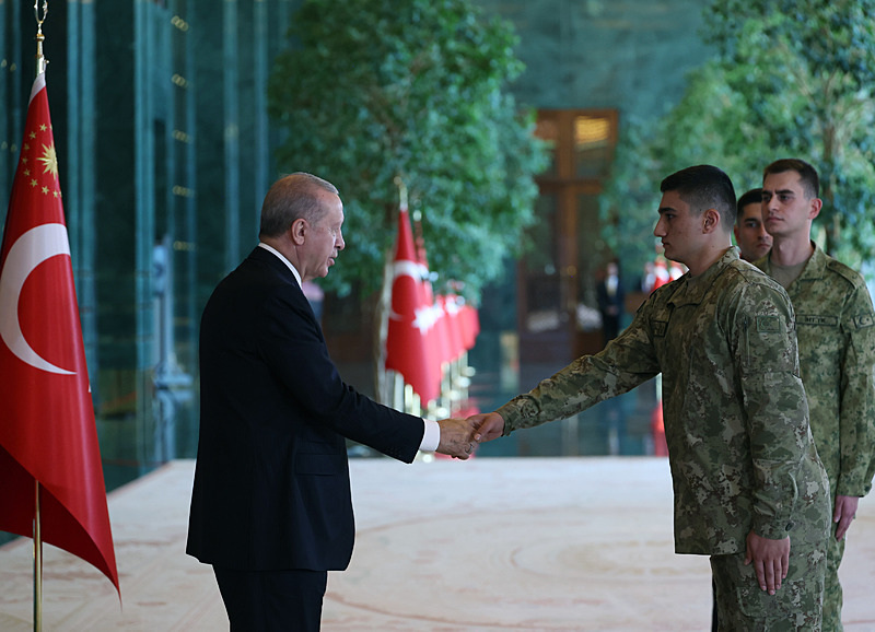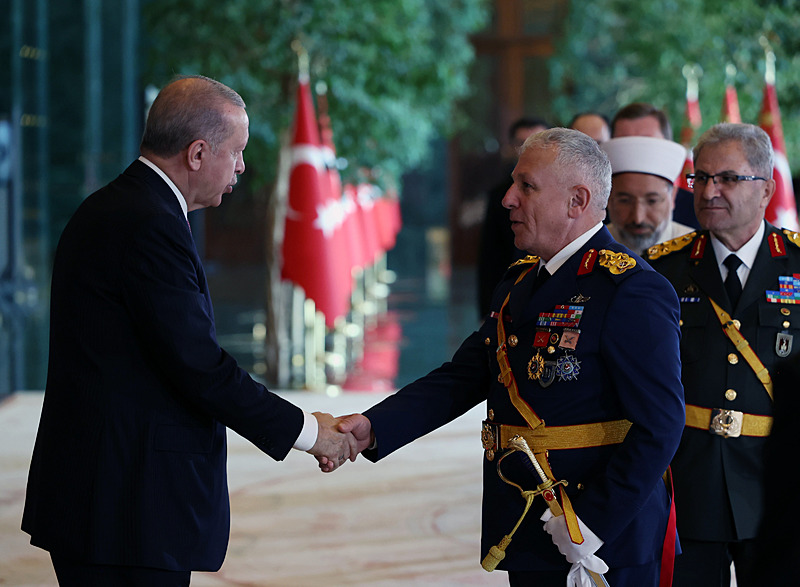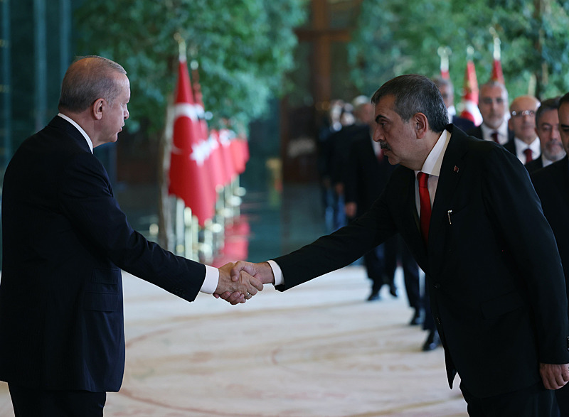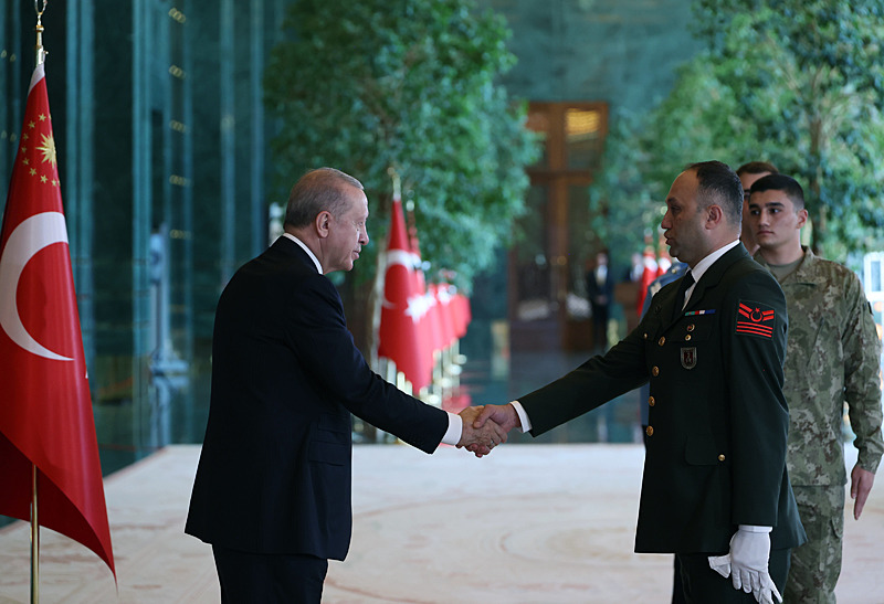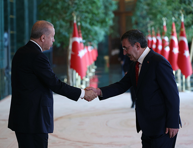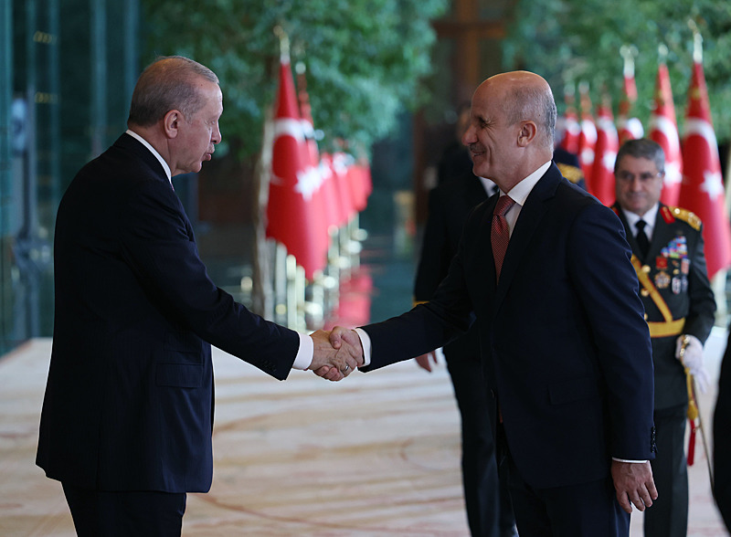 Cumhurbaşkanlığı Külliyesi ana bina girişinde düzenlenen törende; TBMM Başkanı Numan Kurtulmuş, Cumhurbaşkanı Yardımcısı Cevdet Yılmaz, AK Parti TBMM Grup Başkanı Abdullah Güler, Yargıtay Başkanı Ömer Kerkez, Danıştay Başkanı Zeki Yiğit, Cumhurbaşkanlığı Kabinesi üyeleri, Genelkurmay Başkanı Orgeneral Selçuk Bayraktaroğlu ve kuvvet komutanları, Diyanet İşleri Başkanı Safi Arpaguş, TBMM üyeleri, Cumhurbaşkanlığı Genel Sekreteri Hakkı Susmaz, İletişim Başkanı Burhanettin Duran, MİT Başkanı İbrahim Kalın, Savunma Sanayii Başkanı Haluk Görgün, Ankara Valisi Vasip Şahin, Ankara Büyükşehir Belediye Başkanı Mansur Yavaş, kamu kurumlarının yöneticileri, Ankara'da görevli büyükelçiler, yabancı misyon şefleri, uluslararası kuruluşların temsilcileri, Başkan Erdoğan'a tebriklerini sundu