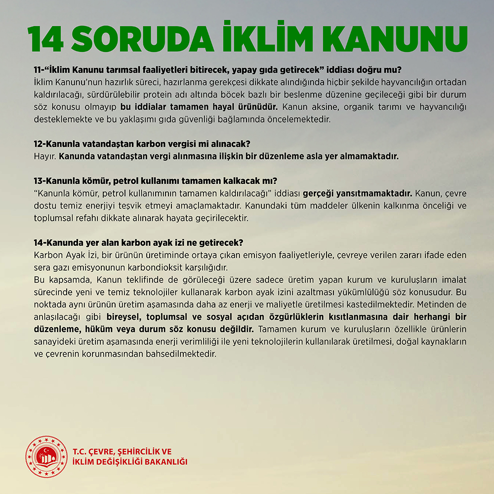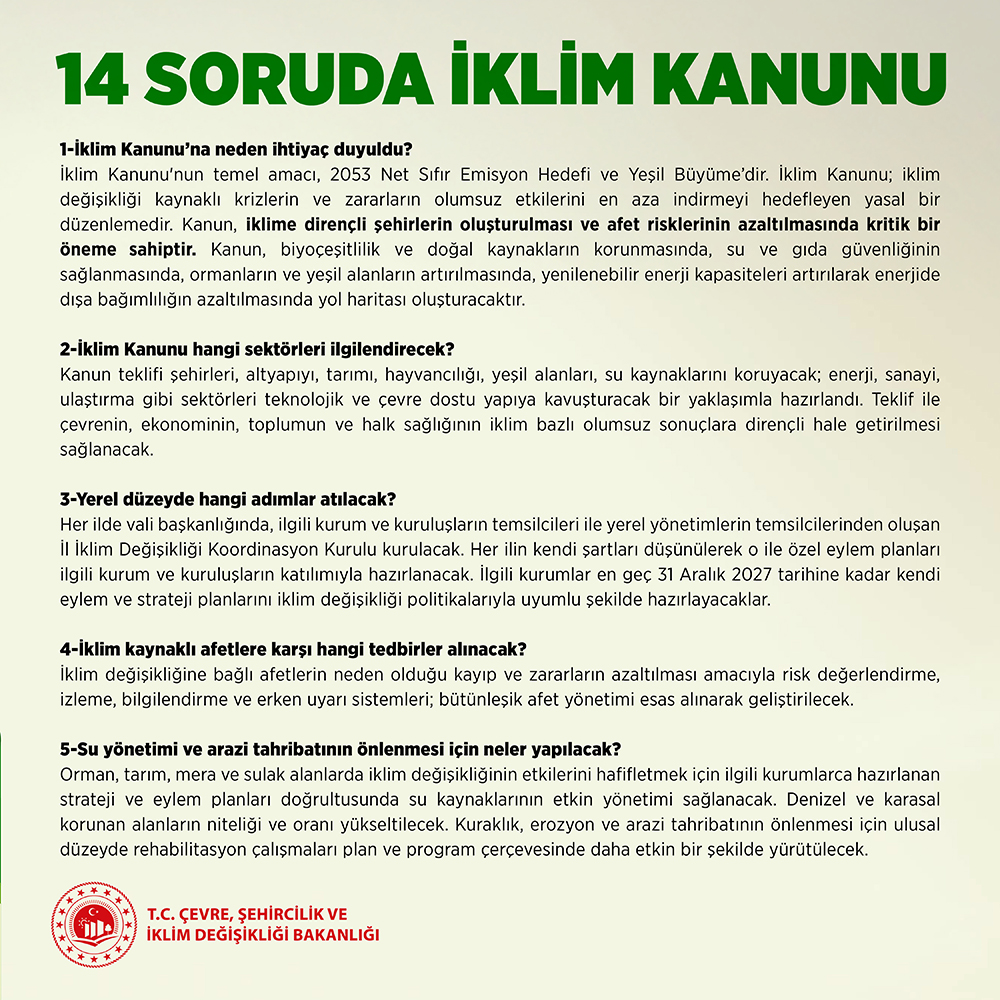 Çevre, Şehircilik ve İklim Değişikliği Bakanlığı, Türkiye'nin ilk İklim Kanunu ile ilgili merak edilen 14 soruyu yanıtladı. 20 madde, 2 geçici madde ve 3 farklı kanunda değişiklik içeren kanun teklifi ile iklim değişikliğiyle mücadele yasal zemine kavuşturulacak. İklim Kanunu ile; iklim değişikliği kaynaklı afetlerin yıkıcı etkilerine karşı dirençli şehirlerin oluşturulması, yenilenebilir enerji kaynaklarının teşvikiyle doğa dostu üretim, biyoçeşitlilik ve yeşil alanların korunması sağlanacak. İşte detaylar...