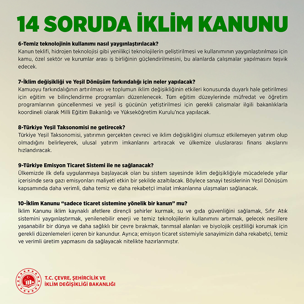 İklim Kanunu iklim kaynaklı afetlere dirençli şehirler kurmak, su ve gıda güvenliğini sağlamak, Sıfır Atık sistemini yaygınlaştırmak, yenilenebilir enerji ve temiz teknolojilerin kullanımını artırmak, gelecek nesillere yaşanabilir bir dünya ve daha sağlıklı bir çevre bırakmak, tarımsal alanları ve biyolojik çeşitliliği korumak için gerekli düzenlemeleri içeren bir kanundur. Ayrıca; emisyon ticaret sistemiyle sanayimizin daha rekabetçi, temiz ve verimli üretim yapmasını da sağlayacak nitelikte hazırlanmıştır.