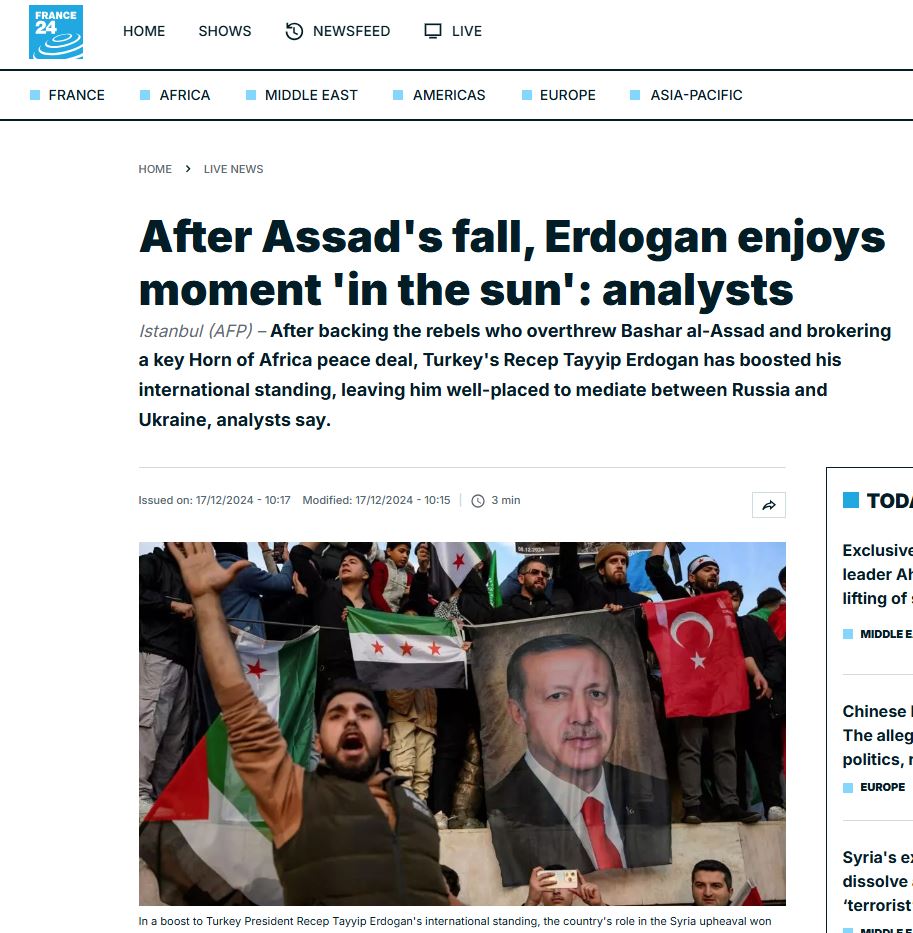 AFP'de yer alan bir analiz-haberde Başkan Recep Tayyip Erdoğan'ın Suriye hamlelerine yer verildi. Başkan Erdoğan'ın Suriye'de kartlarını iyi oynadığı ve Suriye için kıskanılacak bir pozisyonda olduğu yazıldı. Ankara'nın kendinden emin olduğuna vurgu yapılırken, 'Erdoğan en büyük kazanan oldu' ifadelerine yer verildi.