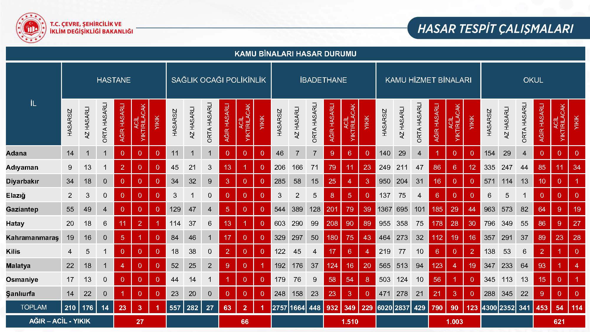 Bugüne kadar 7 bini aşkın personelimizle yapmış olduğumuz hasar tespit çalışmalarında toplam tespit sayımız 1 milyon 582 bin binada tespit yapıldı. Bu çerçevede 4 milyon 859 bin bağımsız bölüm öncelendu bağımsız bölümlerden 214 bin 577 tanesinin acil yıkılacak, ağır hasarlı veya yıkık olduğunun tespitini yaptık ki bu da 608 bin bağımsız bölüme tekabül ediyor. Bu bağımsız bölümlerin 481 bini de konut içerikli binalarımızı oluşturuyor.