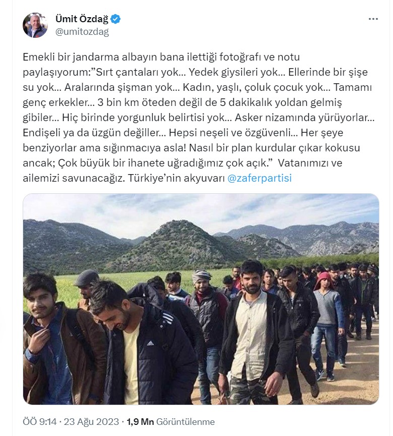 Zafer Partili lideri Ümit Özdağ, sığınmacı karşıtı söylemleriyle tepki topladı. Sosyal medya hesabından bir kez daha sığınmacıları hedef aldı. "Bana emekli Jandarma Albay gönderdi" diyerek paylaştığı fotoğrafın Türkiye'de çekildiği iddiasını ortaya attı. Ancak kısa sürede yalan söylediği ortaya çıktı. Buna rağmen Özdağ paylaşımını yayından kaldırmadı…