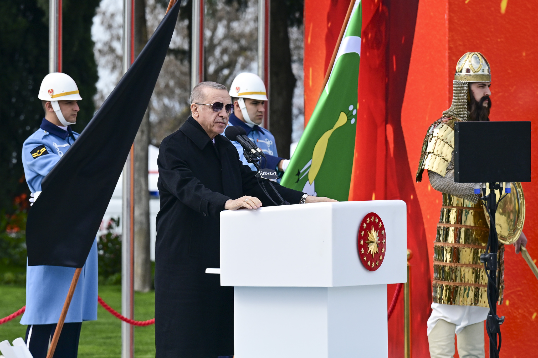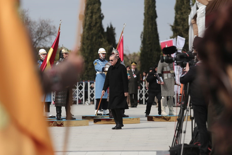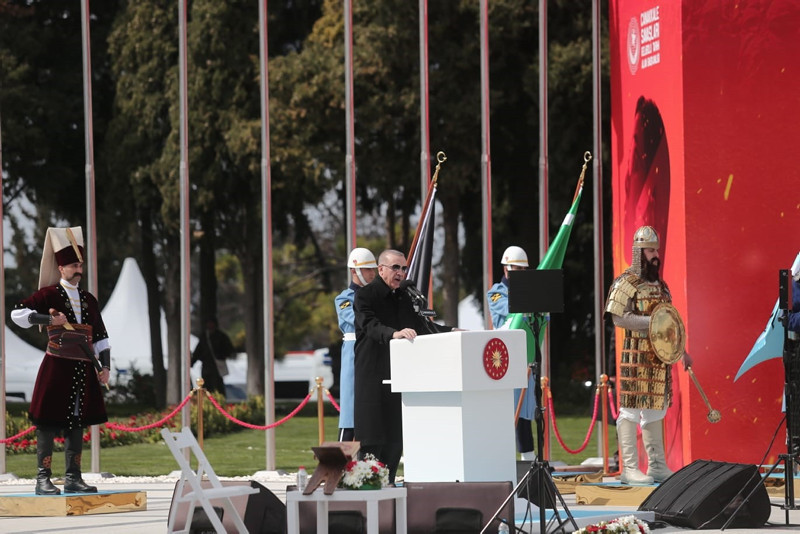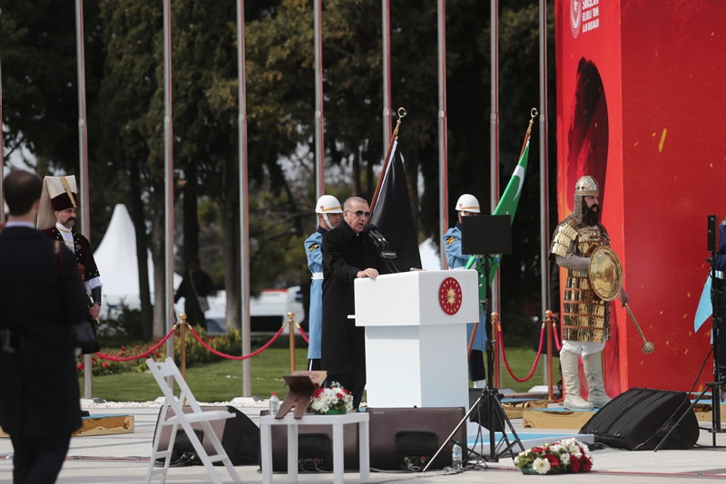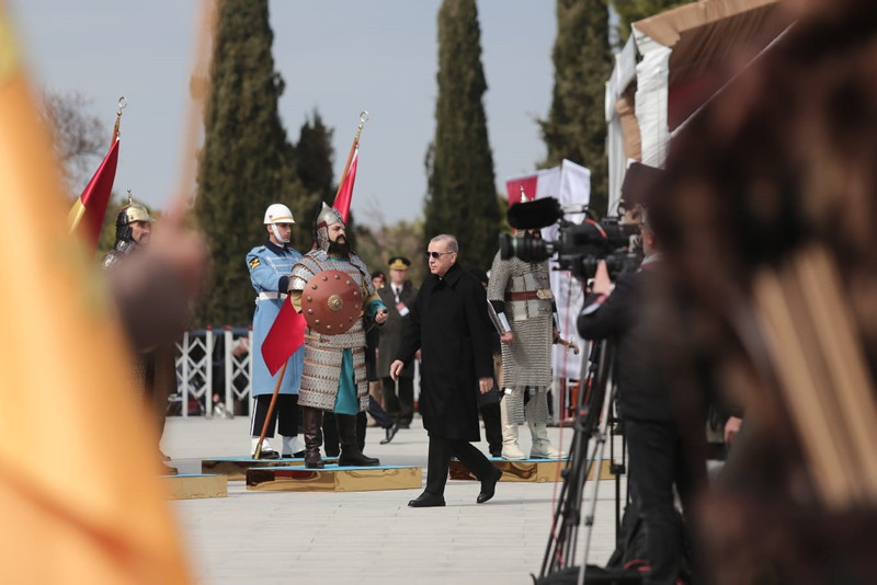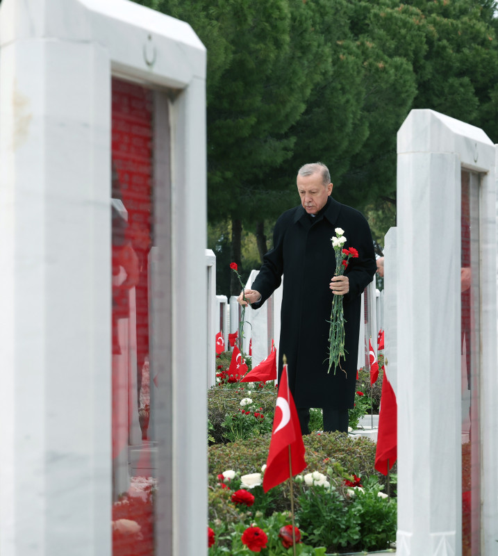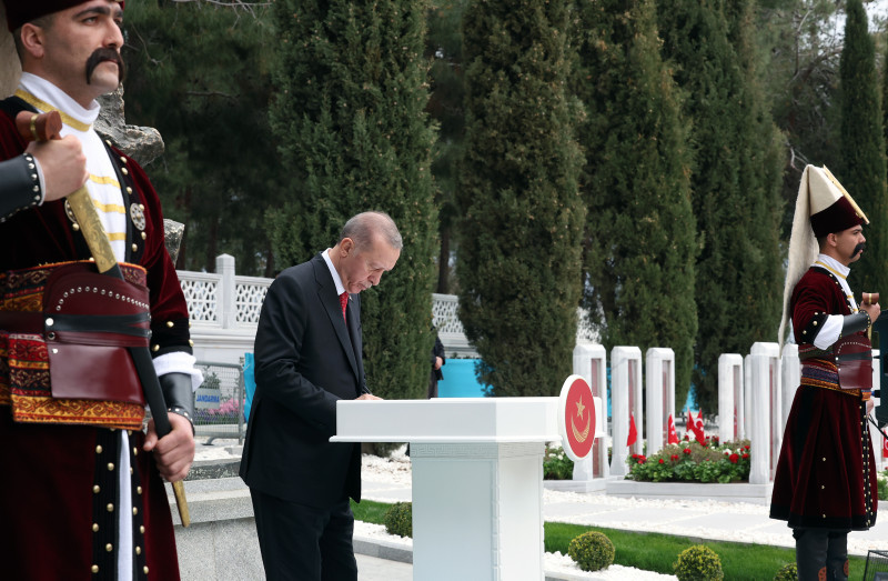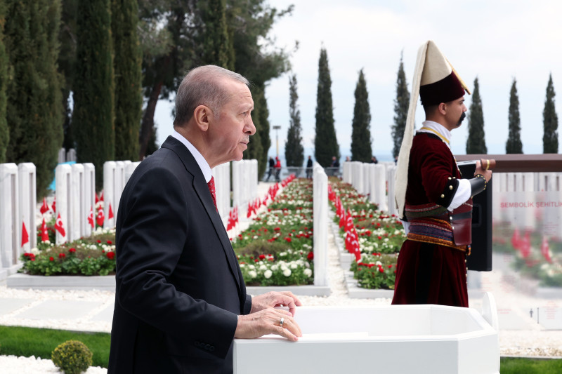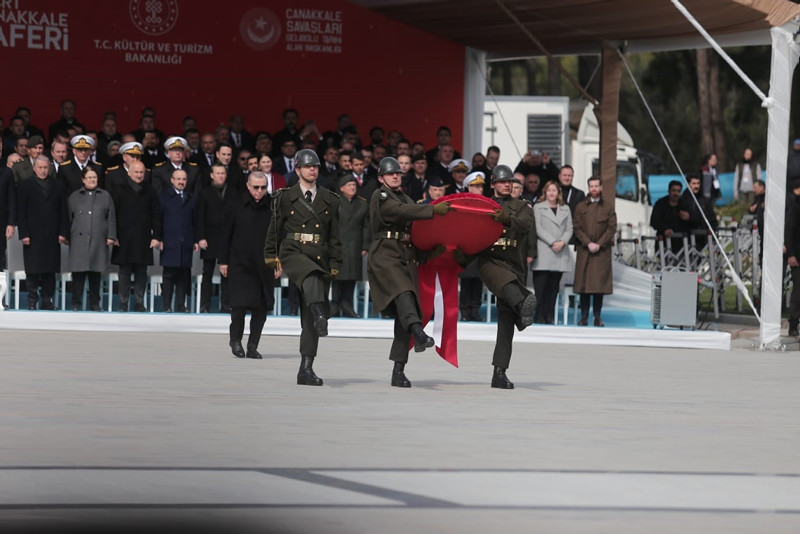 Cumhuriyet'in banisi Gazi Mustafa Kemal'in Çanakkale'yi "bugünümüzü kurtaran, maziye kahramanlığını ve büyüklüğünü iade eden bu toprakları bize ebedi vatan yapan zafer" olarak tarif ettiğini hatırlatan Erdoğan, "Gerçekten de Çanakkale, tarihi şanlı zaferlerle dolu bir milletin asli kimliğini bulduğu, üzerine serpilen ölü toprağını kaldırdığı, tıpkı bir Anka kuşu gibi küllerinden yeniden doğduğu bir dönüm noktasıdır. Tüm yokluk ve imkansızlıklara rağmen dönemin en modern ordularını dize getiren milletimiz Çanakkale'de yazdığı destanla, İstiklal Harbi'mizi zafere ulaştıracak inancı, iradeyi ve direniş ruhunu da kuşanmıştır." dedi.