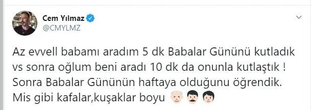 "Az evvel babamı aradım 5 dakika Babalar Günü'nü kutladık. Sonra oğlum beni aradı. 10 dakika da onunla kutlaştık. Sonra Babalar Günü'nün haftaya olduğunu öğrendik. Mis gibi kafalar, kuşaklar boyu…"