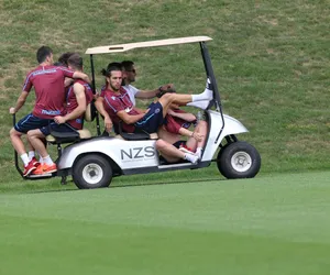 Oyuncuların golf arabasına sıkışık bir şekilde bindikleri gözlenirken bazı oyuncuların ise araca yetişmeye çalışmaları renkli görüntülerin yaşanmasına yol açtı.