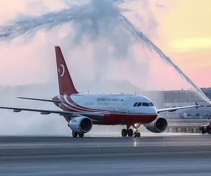 Cumhurbaşkanı Erdoğan'ın uçağının meydana inmesinin ardından geleneksel olarak su takı ile karşılanma töreni yapıldı. Havalimanında çalışanlar ve Türk Hava Yolları personeli tarafından hilal şekli oluşturuldu.