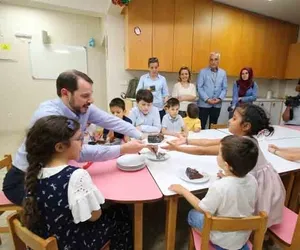 Bakan Albayrak, oğlu Ahmet Akif ve kızı Emine Mahinur ile birlikte Göztepe Semiha Şakir Çocuk Evleri Sitesi'ni ziyaret etti. Onlara pasta kesti..
