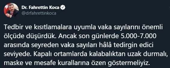 26 Ocak koronavirüs tablosu ile Türkiye'de corona virüsü vaka sayısı vaka sayısı, hasta ve vefat sayısı detayları vatandaşlarımızca günlük son durum detaylarıyla öğrenilmek isteniyor. Sağlık Bakanı Fahrettin Koca Twitter hesabından ve Sağlık Bakanlığı covid19.saglik.gov.tr adresi üzerinden günlük koronavirüs son durum verileri duyuruluyor.