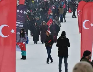 Kars merkez ve Sarıkamış ilçesinde otobüslerle zirveye bırakılan vatandaşlar, ellerinde Türk bayraklarıyla yaklaşık 2 kilometre yürüyerek toplanma alanına geldi.