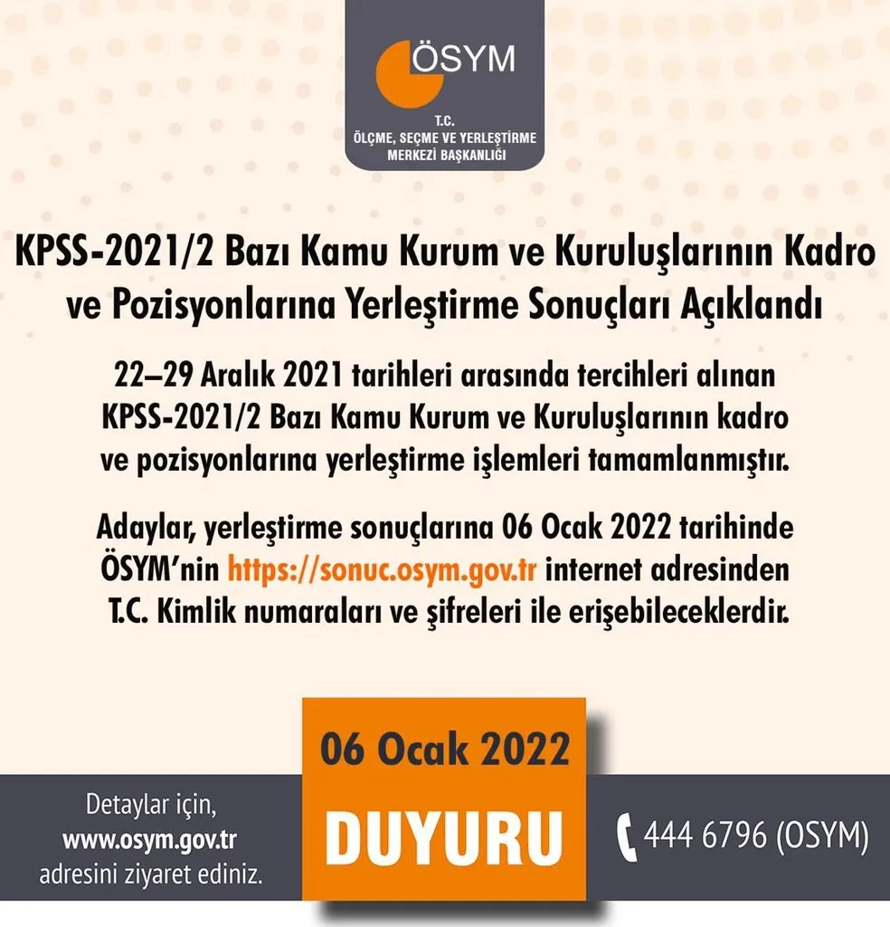 Adaylar, yerleştirme sonuçlarına 06 Ocak 2022 tarihinde saat 13.30'dan itibaren ÖSYM'nin https://sonuc.osym.gov.tr internet adresinden T.C. Kimlik numaraları ve şifreleri ile erişebileceklerdir.