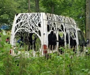 Sanatçının en gözde eserlerinden biri ağaç figürlerinden oyulmuş minibüs...