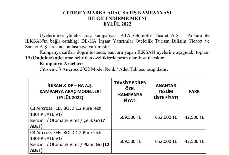 Kampanya 29.09.2022 tarihinde saat 17:00'da sona erecektir. Araç bedelinin tamamını nakit olarak ödemede zorlanan İLKSAN Üyeleri, İkraz (Borç Verme) kullanım şartlarına göre, araç bedelinin 80.000,00 (Seksenbin) TL'ye kadar olan kısmını İLKSAN' dan genel ikraz olarak kullanabilecektir.