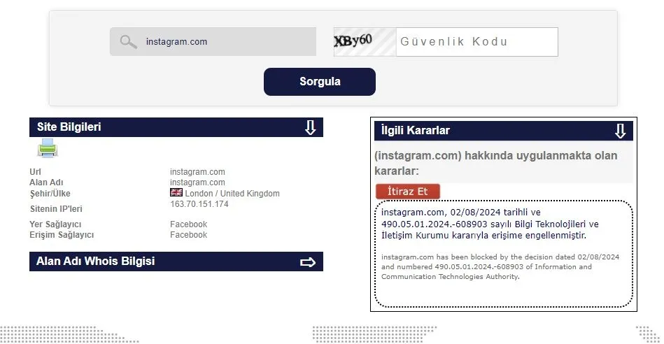 Sosyal medya platformu Instagram'a erişim engeli kararı alındı. Bilgi Teknolojileri ve İletişim Kurumu Instagram'a erişim engeli getirdi. BTK'nın site bilgileri sorgu sayfası kısmında ilgili karar görüldü.