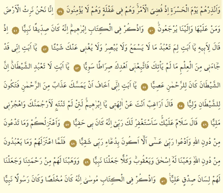 39. Ve enzirhüm yevmel hasrati iz kudıyel emr ve hüm fı ğafletiv ve hüm la yü'minun