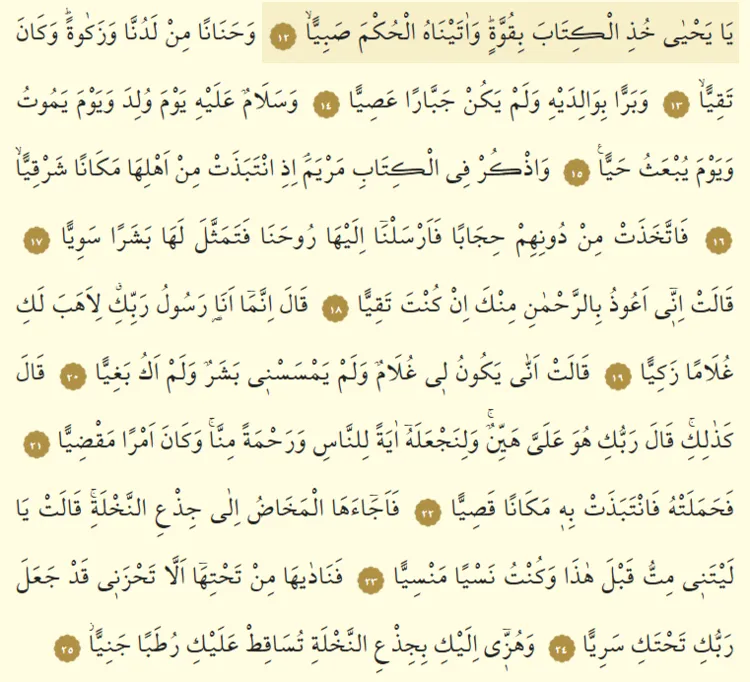 12,13,14. (Yahya, dünyaya gelip büyüyünce onu peygamber yaptık ve kendisine) "Ey Yahya, kitaba sımsıkı sarıl" dedik. Biz, ona daha çocuk iken hikmet ve katımızdan kalp yumuşaklığı ve ruh temizliği vermiştik. O, Allah'tan sakınan, anne babasına iyi davranan bir kimse idi. İsyancı bir zorba değildi.