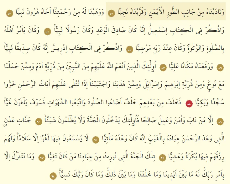 52. Ve nadeynahü min canibit turil eymeni ve karrabnahü neciyya