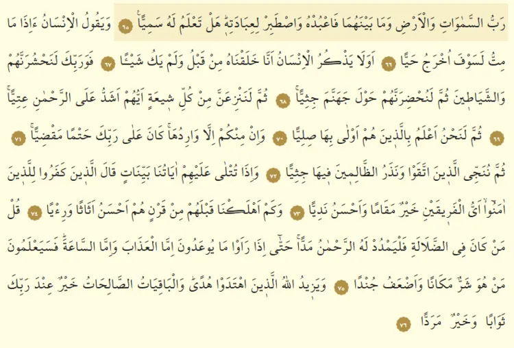 65. Rabbüs semavati vel erdı ve ma beynehüma fa'büdhü vastabir li ıbadetih hel ta'lemü lehu semiyya