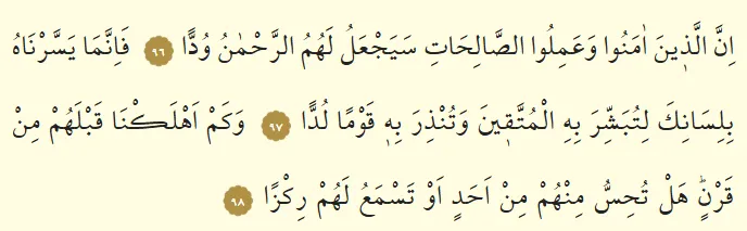96. İnanıp salih ameller işleyenler için Rahmân, (gönüllere) bir sevgi koyacaktır.