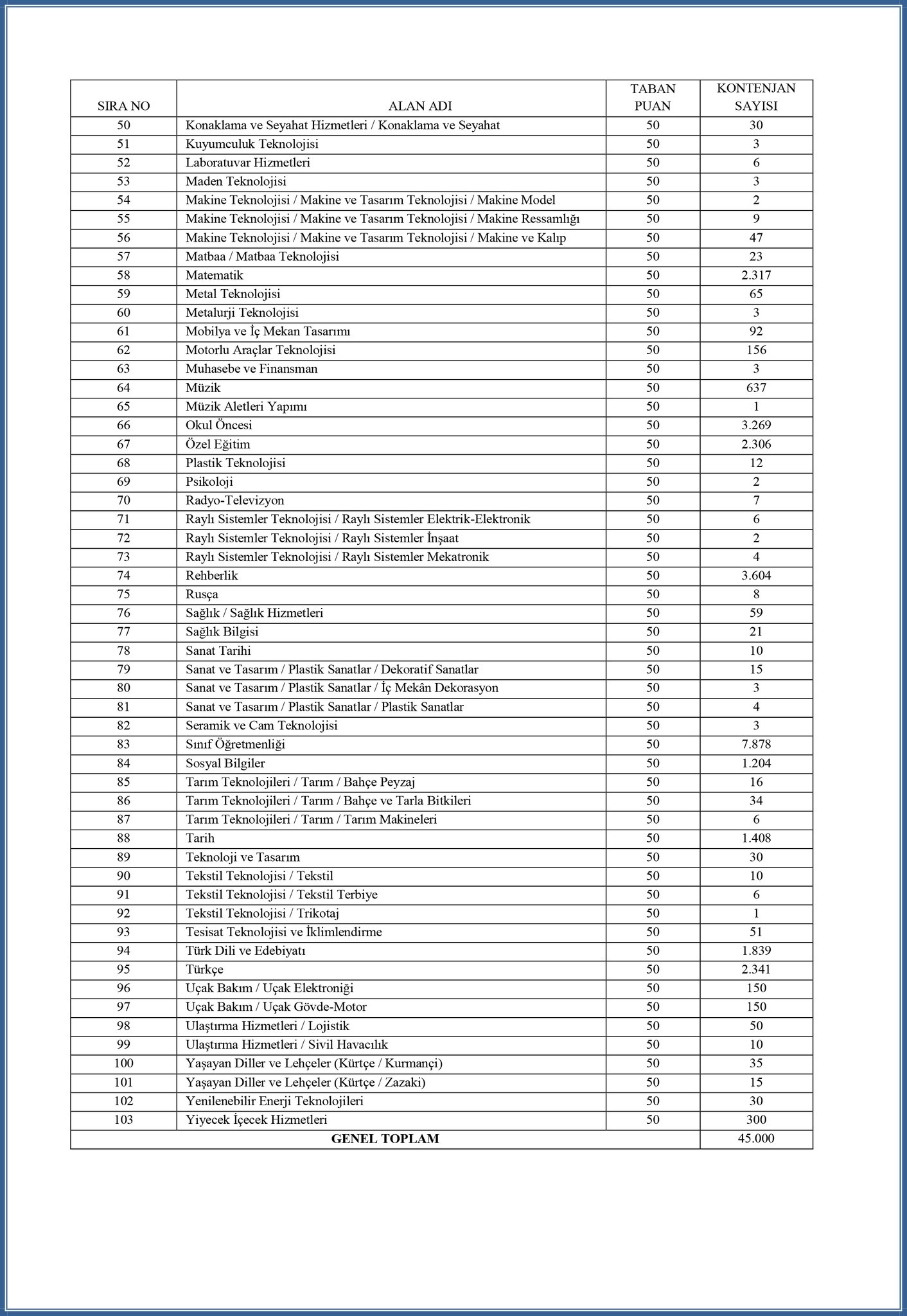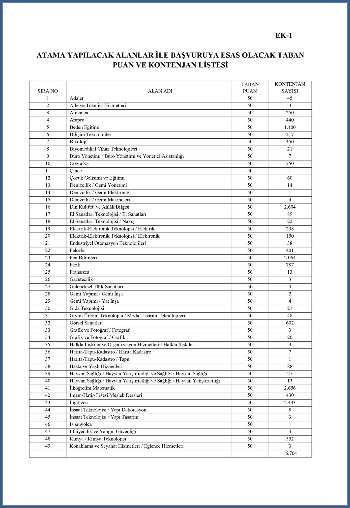 "45 bin öğretmen alımında sınıf öğretmenliği için 7 bin 878 kontenjan, rehberlik alanına 3 bin 604, okul öncesi öğretmenliği 3 bin 269, ilköğretim matematik 2 bin 656, din kültürü ve ahlâk bilgisi alanı için 2 bin 604 kontenjan ayrıldı."