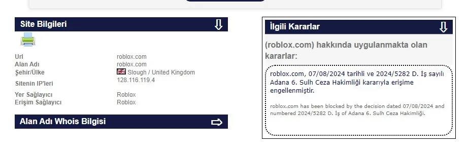 BTK sorgulamasıyla site kontrol edildiğinde Roblox ile ilgili aşağıdaki karar görüntülenebiliyor:
