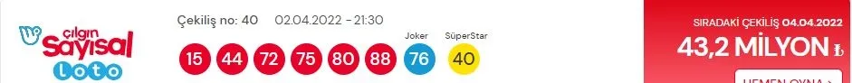 2 Nisan Çılgın Sayısal Loto çekiliş sonuçları ve şanslı numaralarla MPİ büyük ikramiye bilet sorgulama sayfası detayları şöyle;