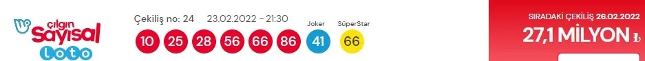 Milli Piyango İdaresi (MPİ) ile Sisal Şans ortaklığında 23 Şubat Çılgın Sayısal Loto çekiliş sonuçları ve bilet sorgulama sayfası detayları şöyle;