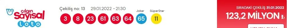 Milli Piyango İdaresi (MPİ) ile Sisal Şans işbirliğiyle birlikte ismine "çılgın" ön adı getirilen "Çılgın Sayısal Loto sonuçları" her hafta Pazartesi, Çarşamba ve Cumartesi günleri olduğu gibi bugün de MP TV canlı yayınında çekilen kazandıran numaralarla şans oyunu severlere duyuruldu. Peş peşe gelen devirlerle 121 Milyon Türk Lirası'nı aşan çılgın büyük ikramiye tutarına sahip olmak isteyenler Milli Piyango Online üzerinden dijital formatta doldurdukları kuponların büyük ikramiye kazanıp kazanmadığını öğrenmek amacıyla "29 Ocak MPİ Sayısal Loto sonuçları açıklandı mı?" soruları üzerinden şanslı numaralara erişmek ve bilet sorgulama yapmak istiyor.