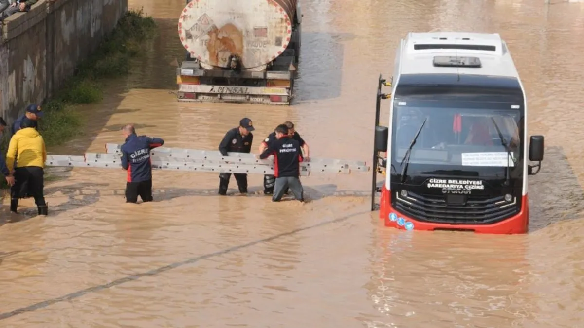 Yafes Mahallesi'nde Cizre Belediyesi'ne ait bir şehir içi otobüsü içerisinde bulunan yolcular ile birlikte sel sularının ortasında kaldı.
