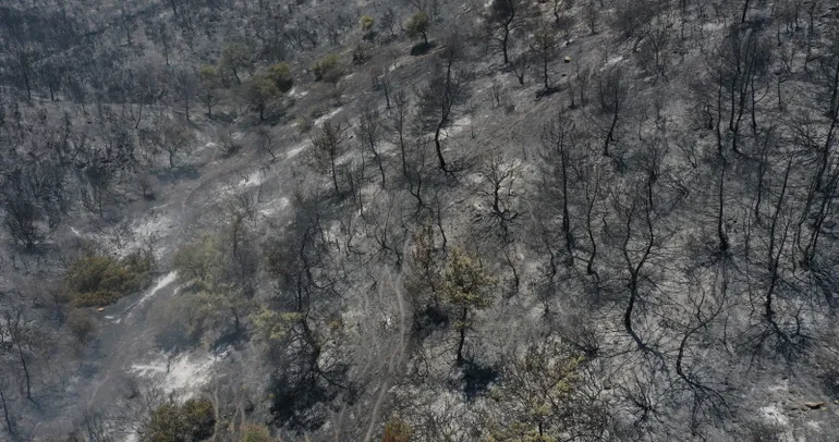 Yaklaşık 300-400 hektar alanın etkilendiği tahmin edilen yangından geriye kalanlar drone ile görüntüledi.