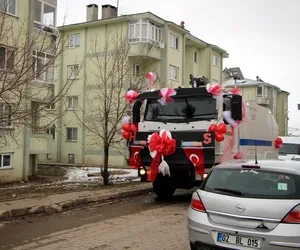 Kaymakamlıktan gerekli izinleri alan damat Ertop, TOMA aracını gelin arabası olarak süsledi ve gelin evine gitti. Vatandaşların meraklı bakışları altında geldiği gelin evinin önünde TOMA'dan siren çalarak sevincini paylaşan damada, mesai arkadaşları zırhlı araçla siren çalarak vatandaşlar da alkışlayarak destek oldu.