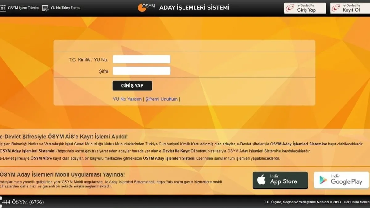 AİS sisteminden T.C. kimlik numarası ve aday şifresi ile giriş yapılacak.