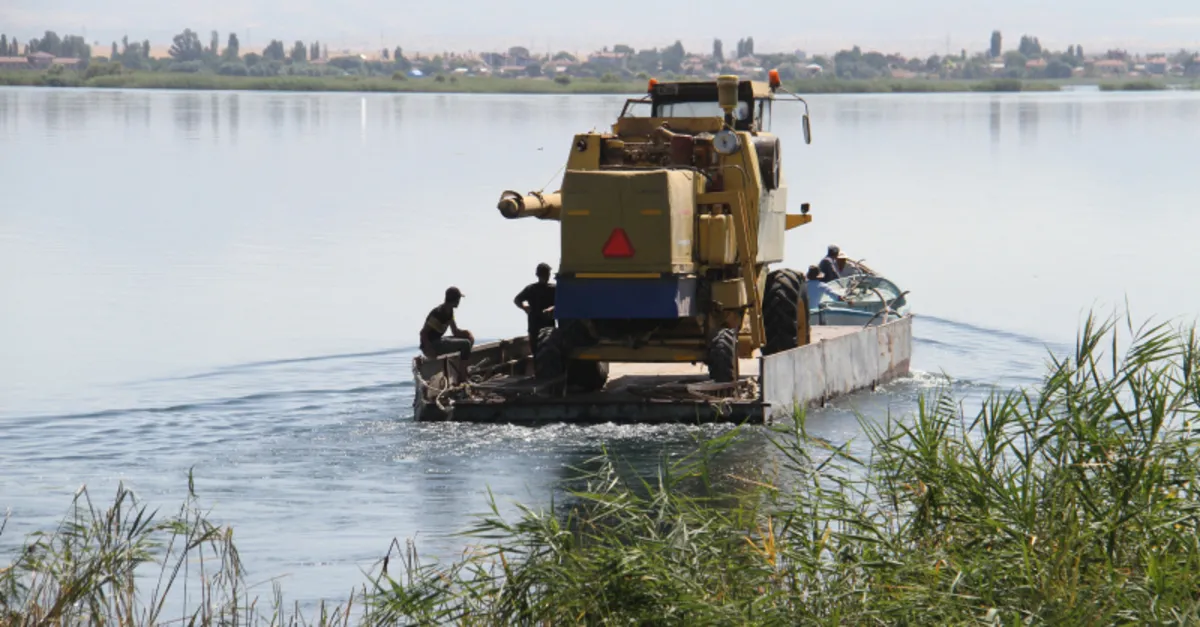 Adaya ürünü hasat etmek için biçerdöver, traktör ve balya makinesi de götürdüklerini vurgulayan Erdoğan, biçerdöver ve diğer tarımsal makinelerin duba üzerine çıkarılarak gölde yüzdürüldüğünü söyledi.