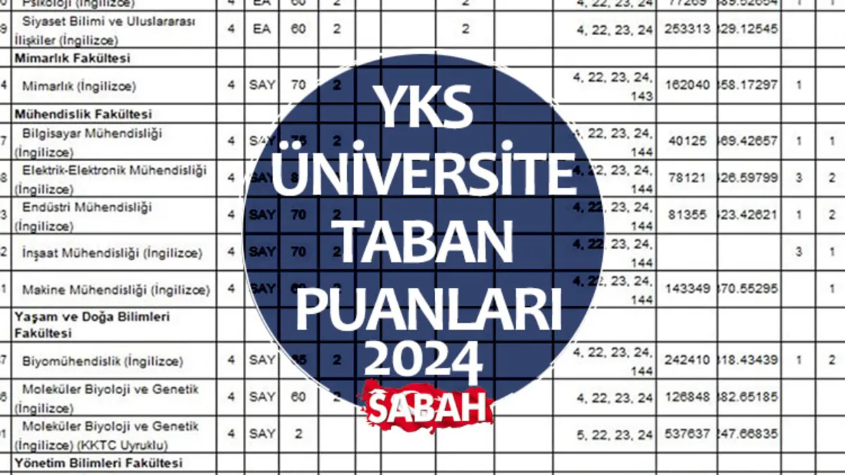 2024 YKS taban puanları, başarı sıralamaları ve kontenjanları henüz belli olmadı. Bu yıla ait taban ve tavan puanları üniversite yerleştirme işlemleri tamamlandıktan sonra belli olacak.