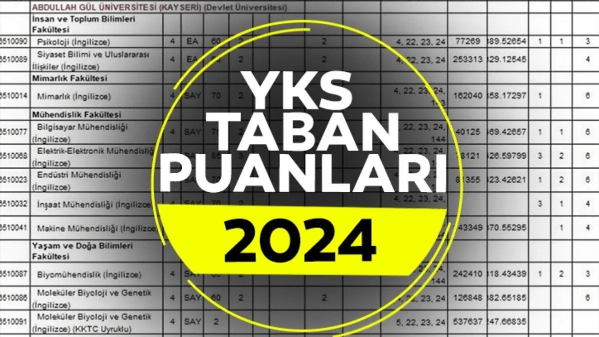 2024 YKS taban puanları, başarı sıralamaları ve kontenjanları henüz belli olmadı. Bu yıla ait taban ve tavan puanları üniversite yerleştirme işlemleri tamamlandıktan sonra belli olacak.
