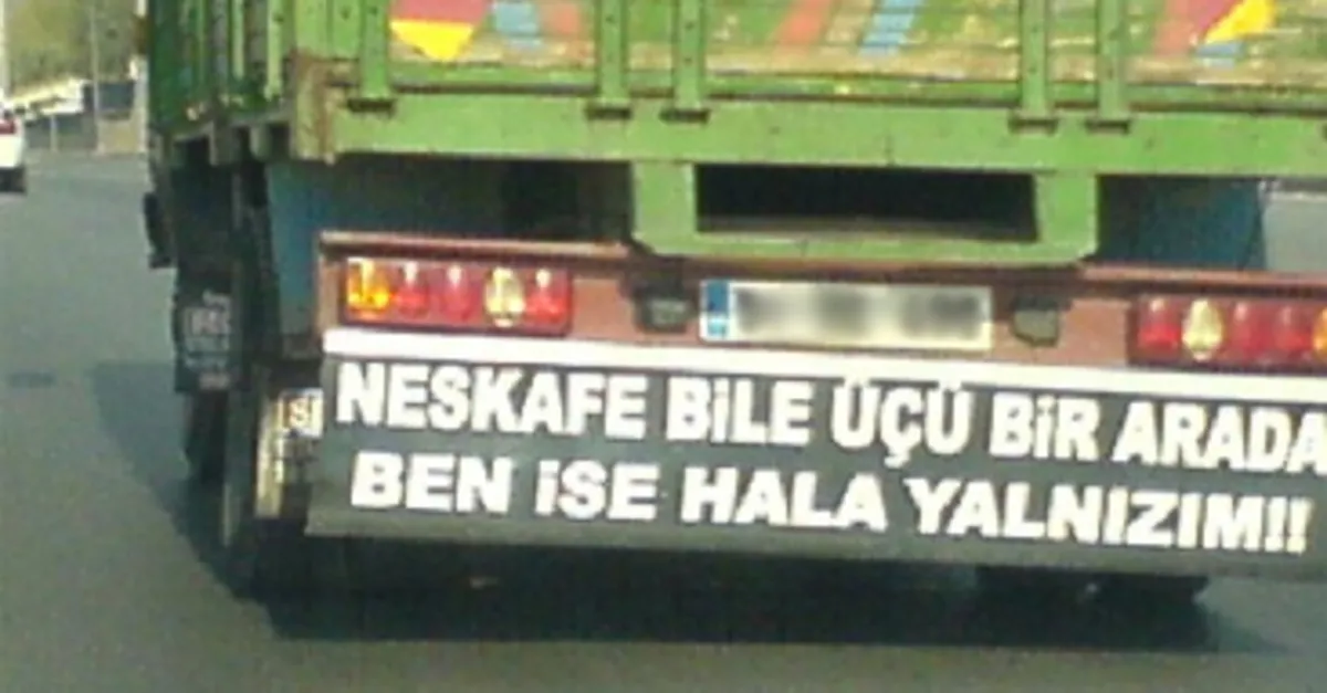 Türk milletinin mizah gücünün yüksekliği şüphe götürmez! Bu durumla da en çok trafikte ya da tezgahlardaki yazılarda denk geliyoruz denilebilir. Bazı vatandaşlar trafiğe çıktıkları araçlara öyle yazılar yazıyor ki gülümsememek ve şaşırmamak elde değil. Bu araçların çoğu da kamyon ve kamyonet. İşte sizi hem gülümsetecek hem de düşündürecek o kamyon arkası yazıları...
