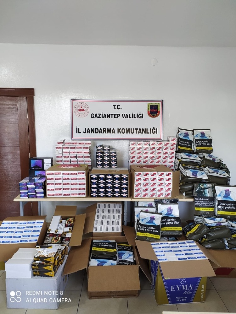 Edinilen bilgiye göre Gaziantep İl Jandarma KOM Şube Müdürlüğü, Şahinbey İlçe Jandarma Komutanlığı’na bağlı Borç Jandarma Karakol Komutanlığı ekipleri, istihbari çalışmalar sonucunda Karagöz mahallesinde bulunan M.Ö. isimli bir şahsın iş yerine şok baskın düzenlendi. İş yeri ve eklentilerinde yapılan aramalarda, 132 bin 200 adet faturasız ve bandrolsüz makaron, 71 kilo 250 gram tütün, 105 paket sigara, 675 adet puro, 40 paket ise içi kıyılmış tütün ele geçirildi.