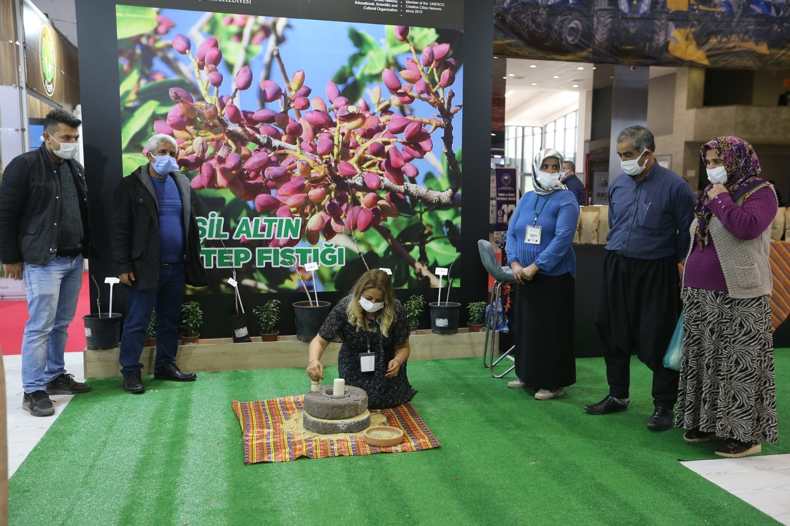“Başkanımıza çok teşekkür ederiz” Gelen çiftçilerin sorularını yanıtlayan Ezogelin Tarım Kooperatifi üyesi Senem Türkkan, “Büyükşehir Belediye Başkanı Fatma Şahin’in bize verdiği destekle ilk önce gittiğimiz kooperatif kurslarında 7 kadın birleşerek küçücük bir çalışma alanı oluşturduk ama şu anda inanılmaz yerlerdeyiz. Güzel yerlere geldik. Daha da geleceğiz. Şu anda 7 kişiyiz fakat ileride çok daha büyük bir aile olacağımıza eminim. Ziyarete gelen kişiler, fidelerimizi, nar ekşimizi, biberimizi, patlıcanımızı her şeyi soruyorlar, ilgi gösteriyorlar. Bunun içinde başkanımıza çok teşekkür ederiz. Özellikle kuru sebzelere olan ilgi büyük” diye konuştu. Oğuzeli’nin Uğurova köyünde Antep fıstığı üretimi yapan Mustafa Boybeyoğlu, stantta eğitimler ve Antep fıstığının üretimi hakkında bilgiler aldığını, yeni projelere katılmak istediğini belirtti.