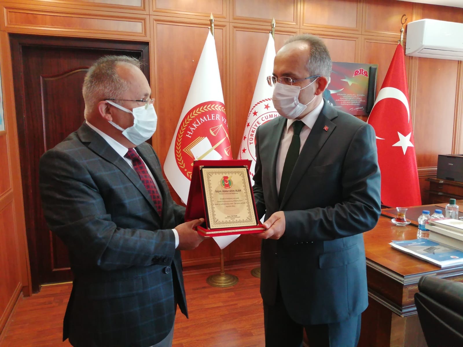 Giresun’dan Zonguldak Cumhuriyet Başsavcılığına atanan Abdürrahim Alan’a Giresun Gazeteciler Cemiyeti üyeleri tarafından ziyaret gerçekleştirildi. Giresun Cumhuriyet Başsavcısı Abdurrahim Alan, geçtiğimiz günlerde Hâkimler ve Savcılar Yüksek Kurulu (HSYK) kararı ile Zonguldak Cumhuriyet Başsavcılığına, Kilis Cumhuriyet Başsavcısı Serdar Durmuş ise Giresun’a atandı. Yaklaşık 4 yıldır Giresun’da görev yapan Cumhuriyet Başsavcısı Abdurrahim Alan’a yeni görev yerine atanması nedeniyle Giresun Gazeteciler Derneği Başkanı Bekir Bayram, Yönetim Kurulu üyeleri ve gazeteciler ziyarette bulundu. Giresun’da görev yaptığı süre içerisinde yerel basına destek, gazetecilerin doğru bilgi alma konusundaki katkıları nedeniyle Giresun Gazeteciler Derneği adına plaket verilen Cumhuriyet Başsavcısı Abdurarhim Alan, “Giresun’da yaklaşık dört yıl boyunca hizmet verdik basınla uyumlu bir çalışma içerisinde olduk. Herkese adil, tarafsız ve herkese aynı mesafede olacak şekilde görev süremi tamamlamaya çalıştım. İnşallah buna muvaffak olmuşumdur diye düşünüyorum. Giresun basını ve Giresunlu hemşerilerimiz olarak hakkınızı helal etmenizi istirham ediyorum. Bizim hakkımız helaldir. Giresunlular’a teşekkür ediyorum” ifadelerini kullandı. Giresun Gazeteciler Derneği Başkanı Bekir Bayram ise demokrasinin vazgeçilmezi olan adalet ve basın özgürlüğü konusunda gösterdiği hassasiyetten dolayı teşekkür etti.