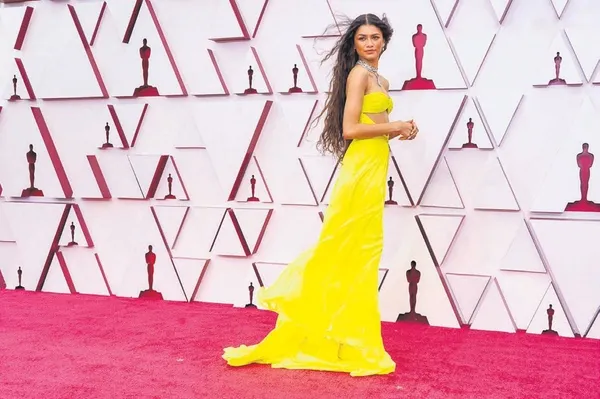 Zendaya incecik fiziğinin avantajını kanarya sarısı Valentino elbisesiyle öyle güzel kullanmış ki hayran olmamak elde değil. Doğal saçı ve makyajı müthiş canlı renkteki elbisesinin tamamlayıcısı olmuş. Ama görünümün en çarpıcı noktası olan Bulgari mücevherleri es geçmek olmaz. Zendaya bu görünümüyle Tüm Zamanların En İyi Oscar Elbiseleri listesine kesinlikle girmiştir. Ayrıca tören boyunca maskesini takan ve çıkarmadan oturan tek ünlü olması da büyük bir özveri!
