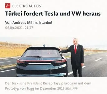 Alman basınından Frankfurter Allgemeine Zeitung (FAZ) gazetesinde yayınlanan 'Türkiye, Tesla ve Volkswagen'e meydan okuyor' başlıklı haberde, yerli otomobil TOGG ve Türkiye'nin otomobil üretimi macerasına geniş yer verildi.