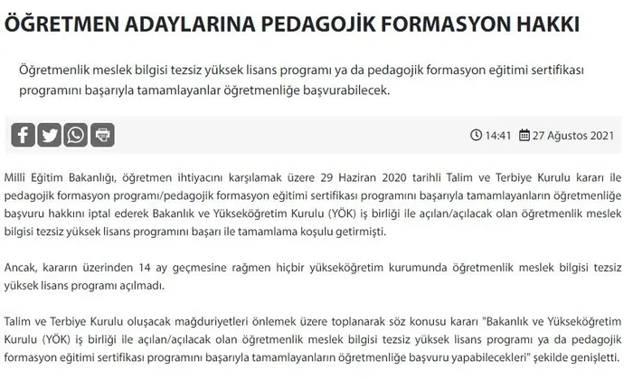 2020 yılına kadar Eğitim Fakülteleri dışında Fen-Edebiyat Fakülteleri mezunları da pedagojik formasyon sertifikası ile öğretmen olmaya hak kazanıyordu. Ancak geçtiğimiz yıl bu durum ortadan kalktı ve tezsiz yüksek lisans şeklinde formasyon eğitimi verileceği duyuruldu. Milli Eğitim Bakanlığı'nın yaptığı son açıklamaya göre, söz konusu yüksek lisans programının YÖK ve MEB iş birliği ile düzenleneceği açıklandı.